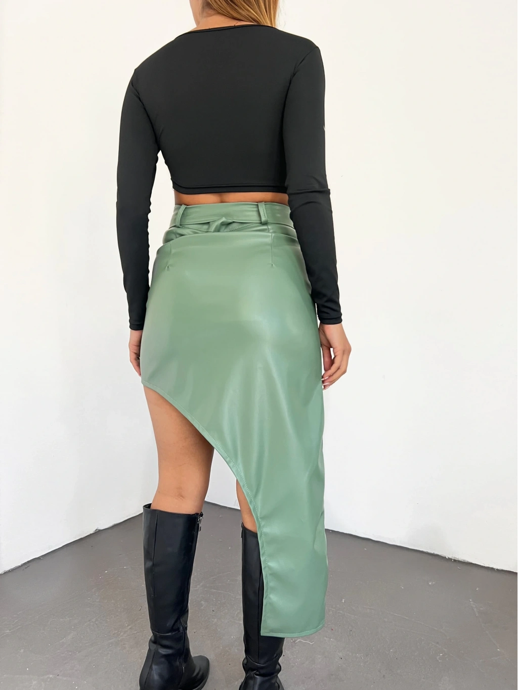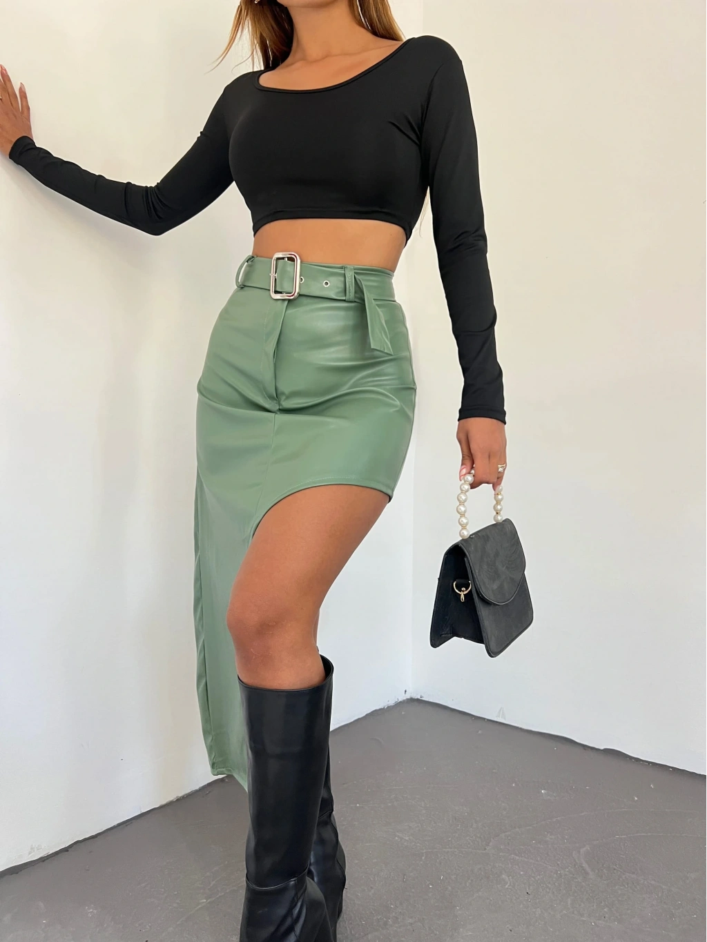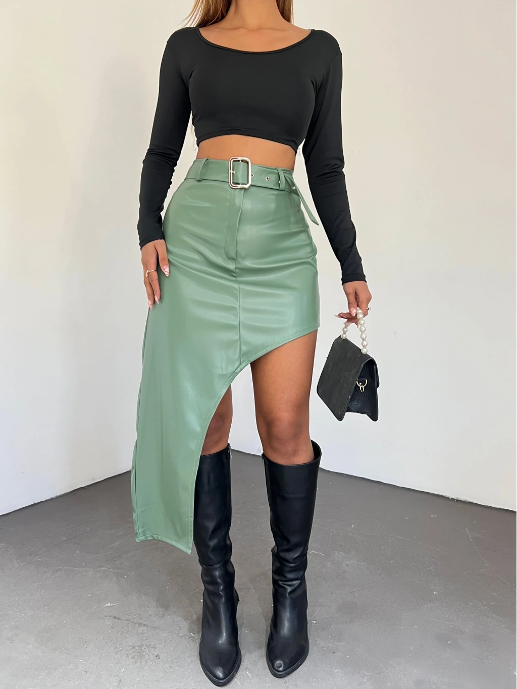 Ürün Adı : Derin Yırtmaç Detaylı Kemerli Suni Deri Etek