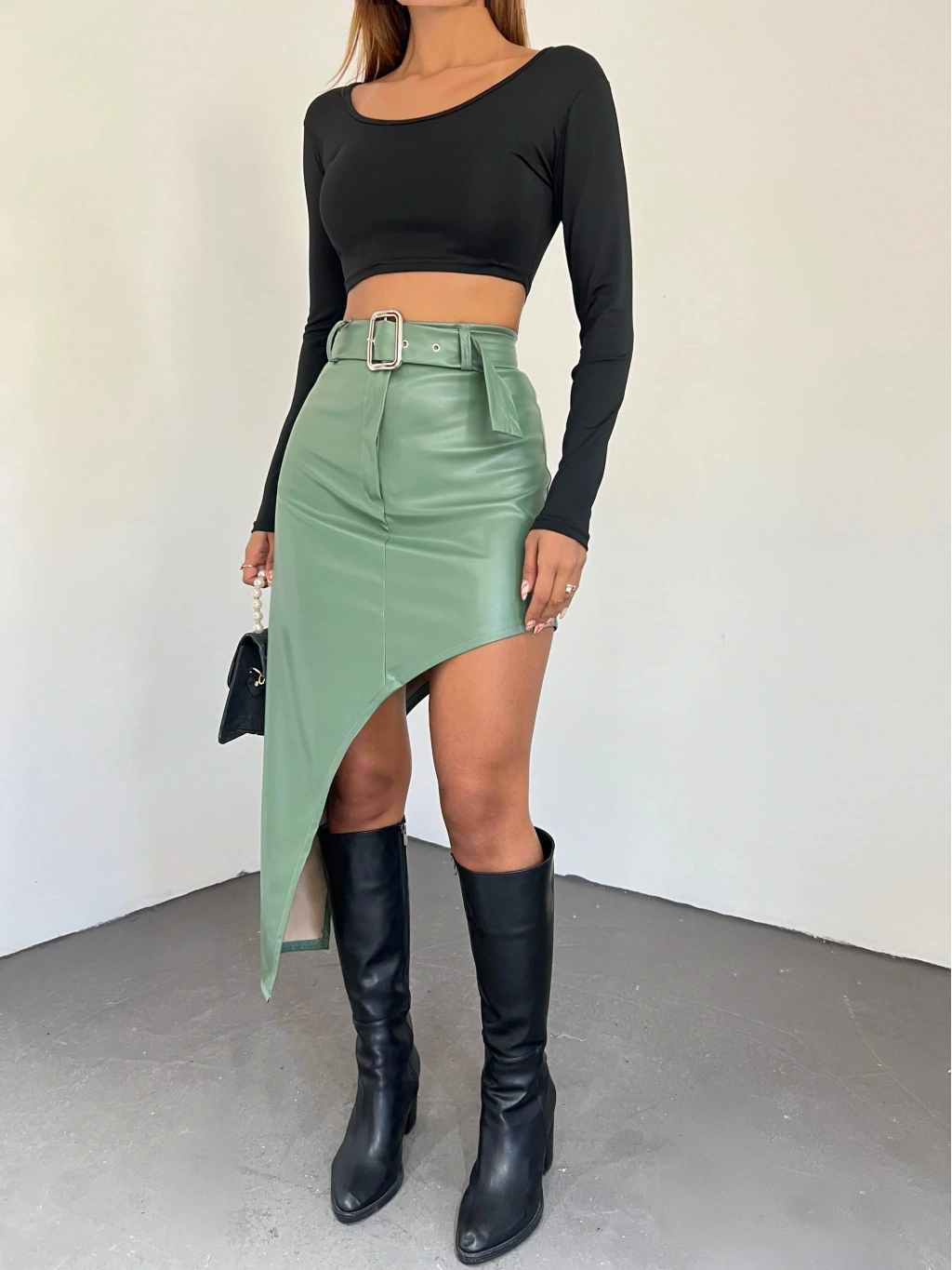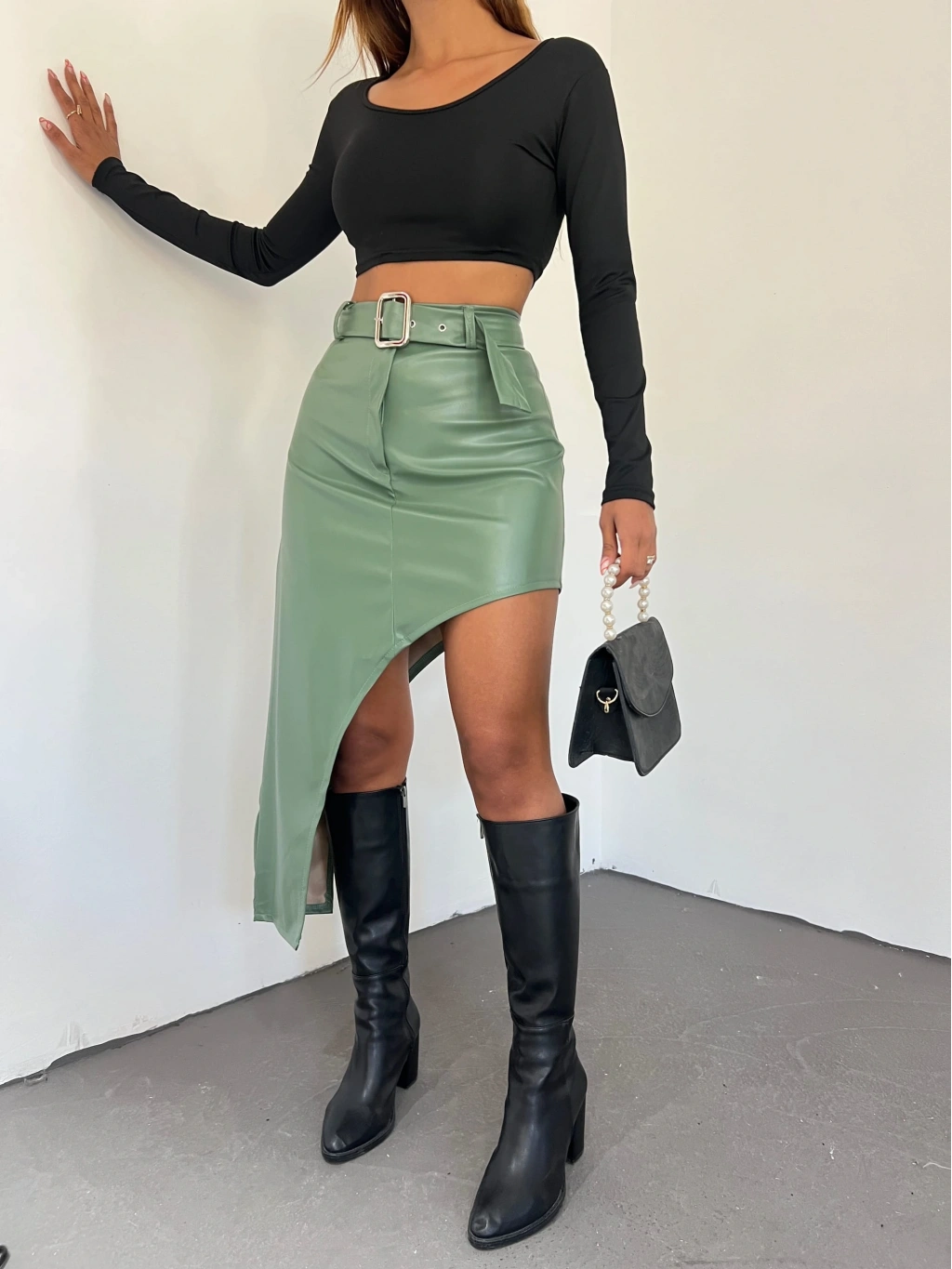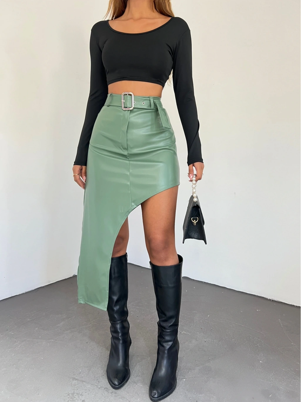 Ürün Adı : Derin Yırtmaç Detaylı Kemerli Suni Deri Etek