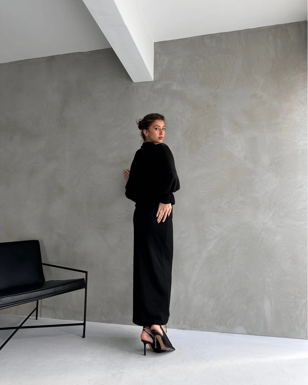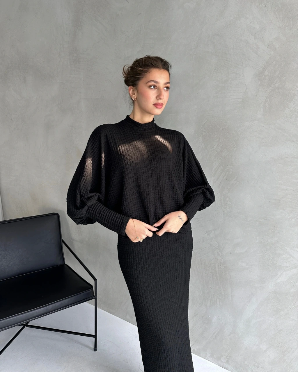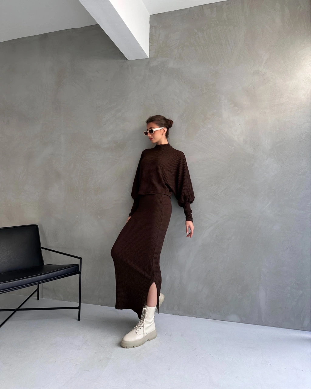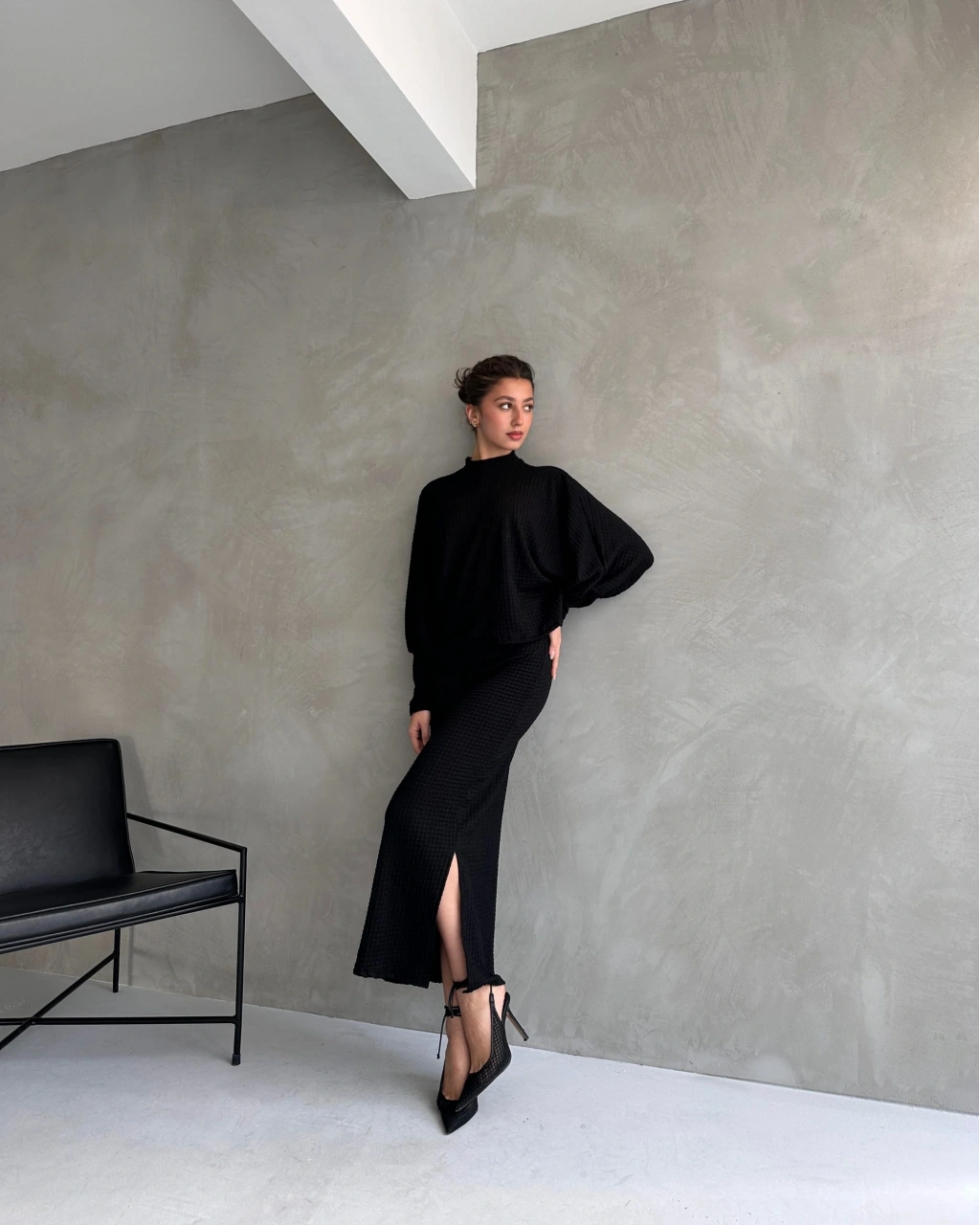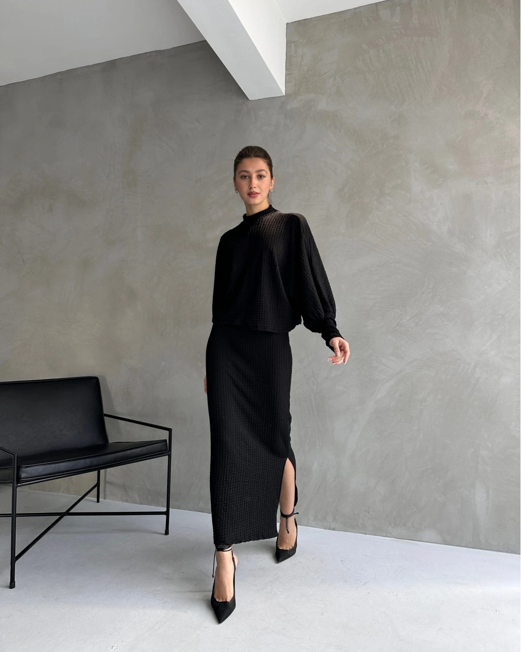 Ürün Adı :Dokulu Yırtmaç Detaylı Etek Ve Bluz 2'Lİ Takım