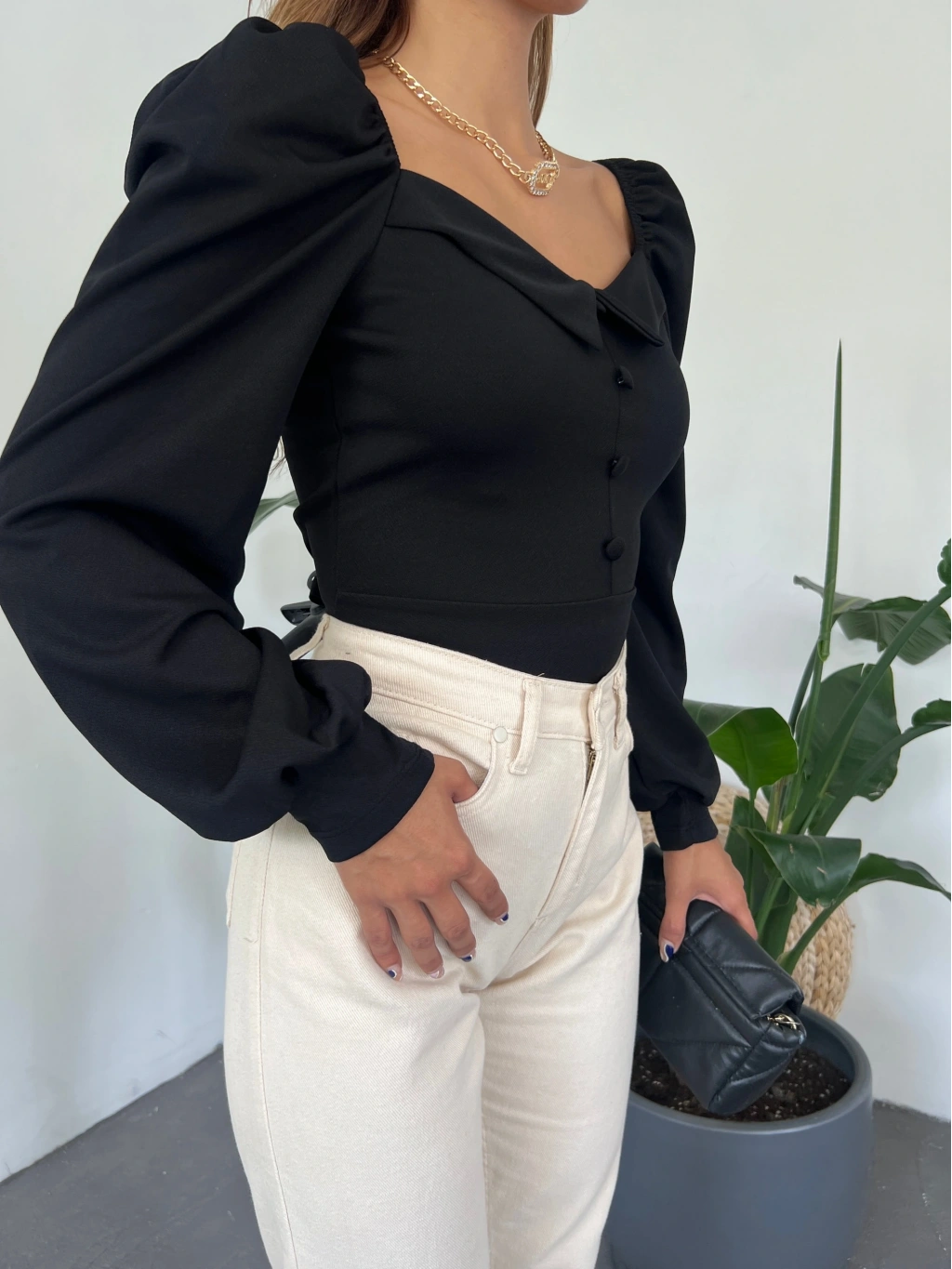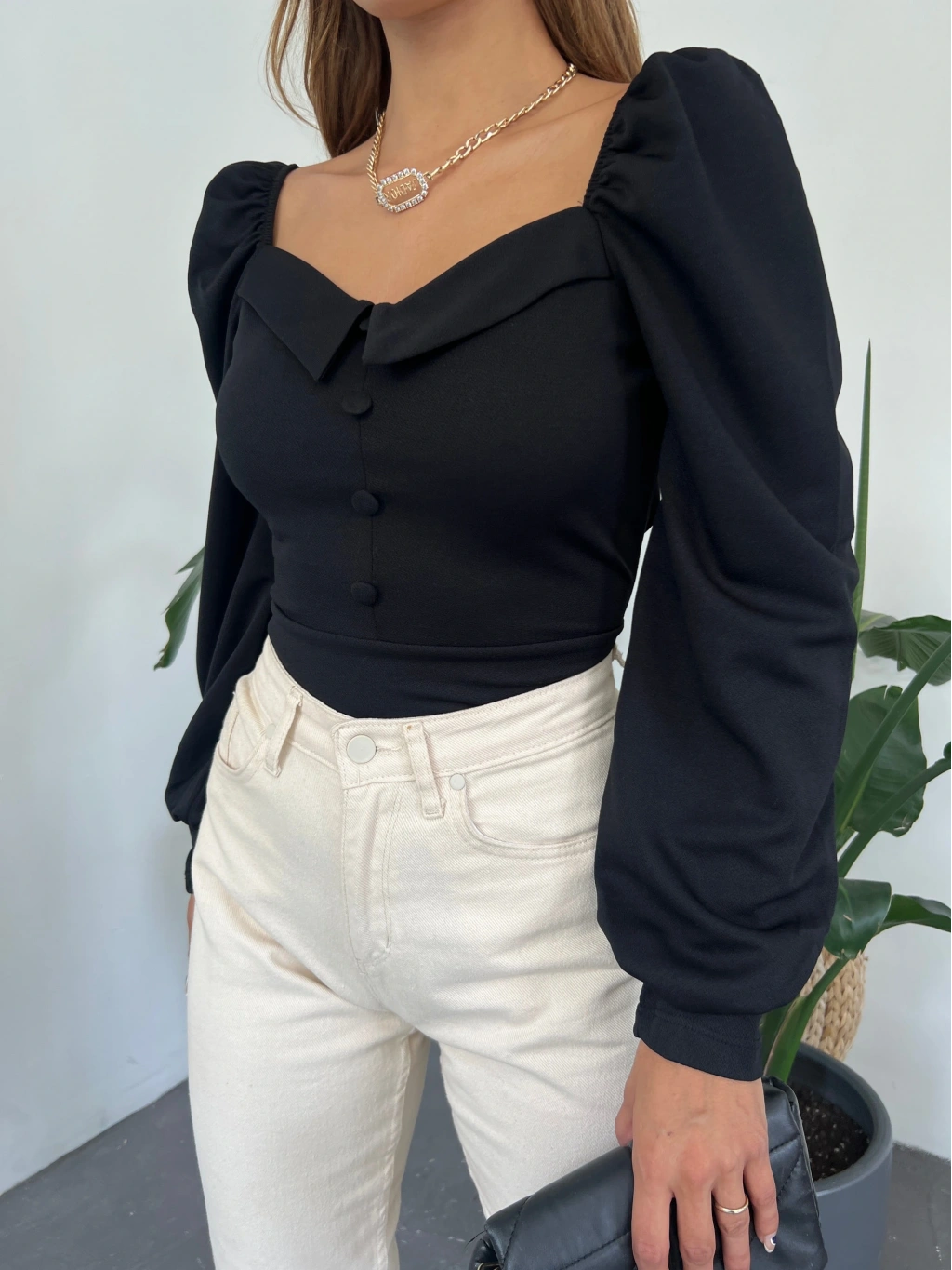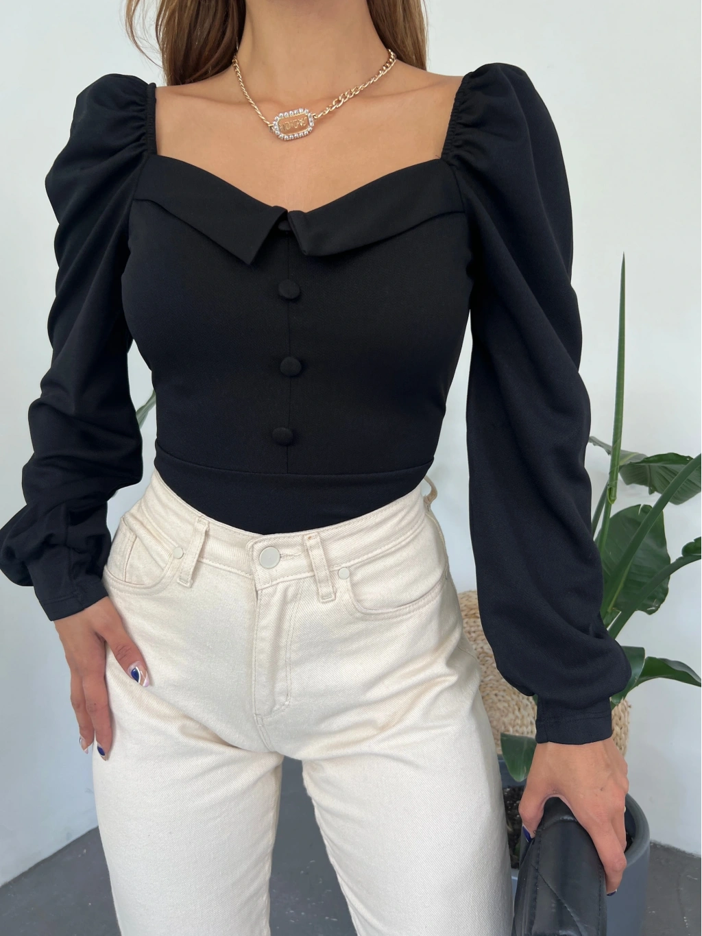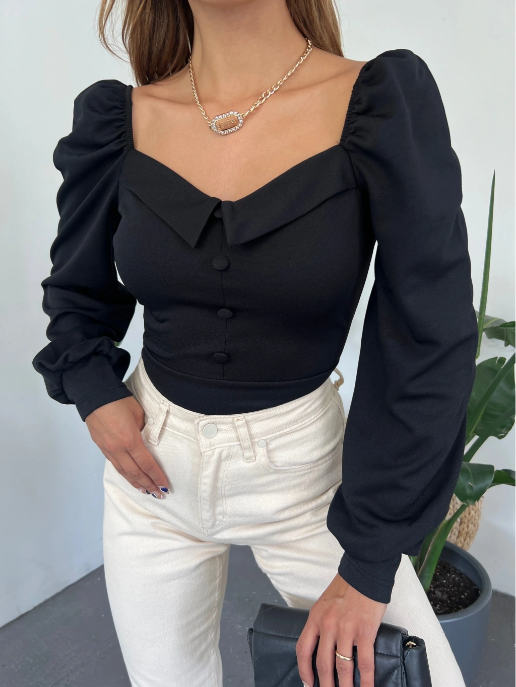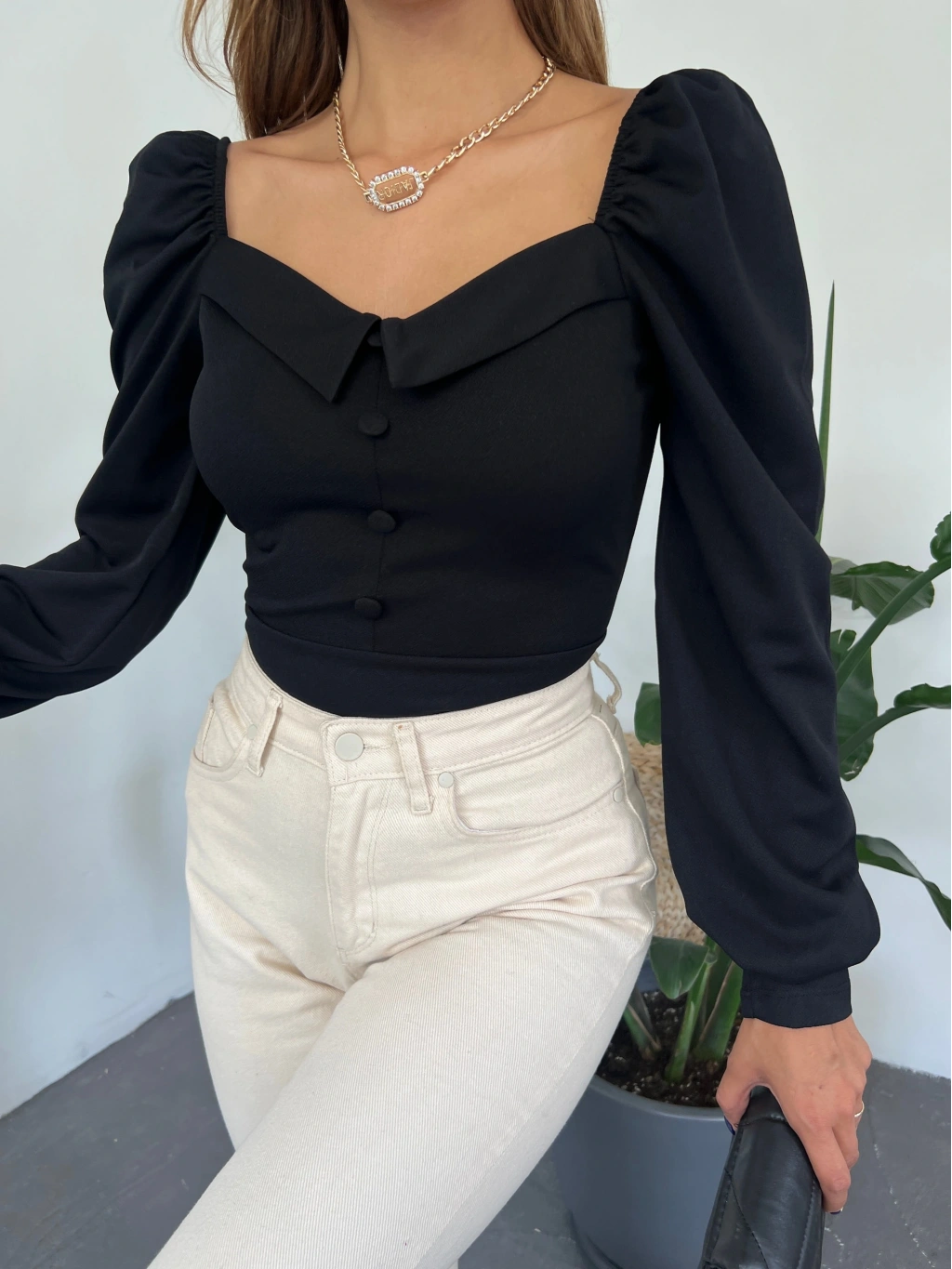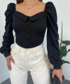 Ürün Adı : Gömlek Yaka Düğme Detaylı Prenses Kol Crep Bluz