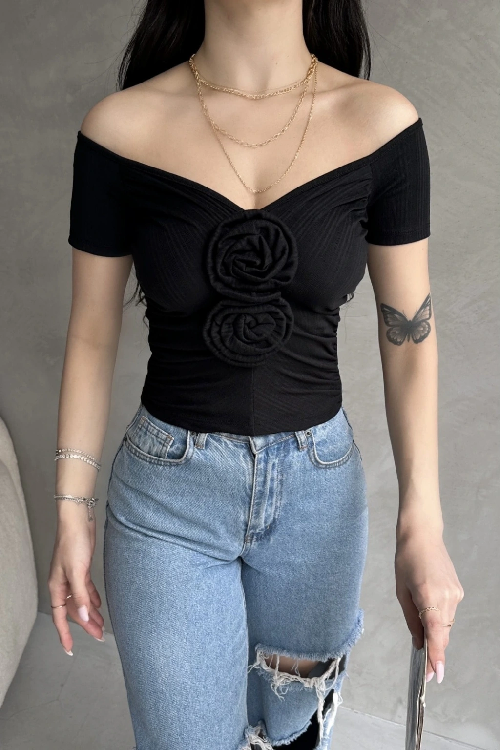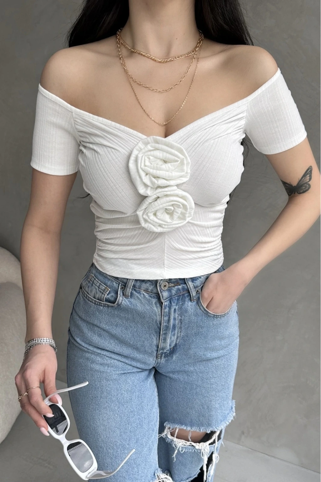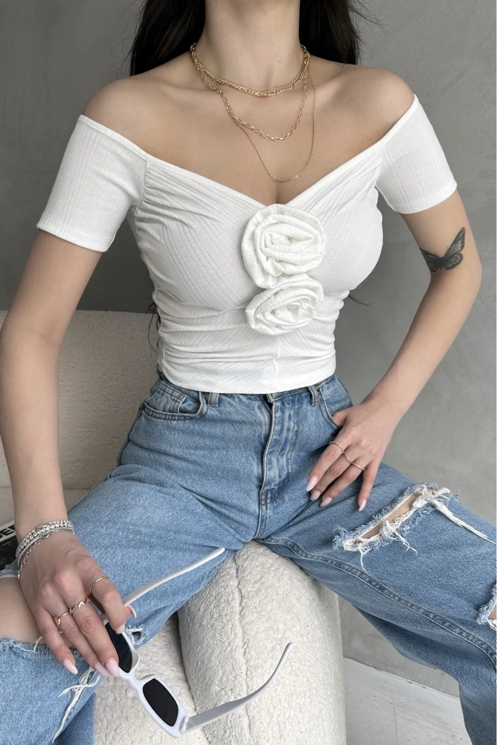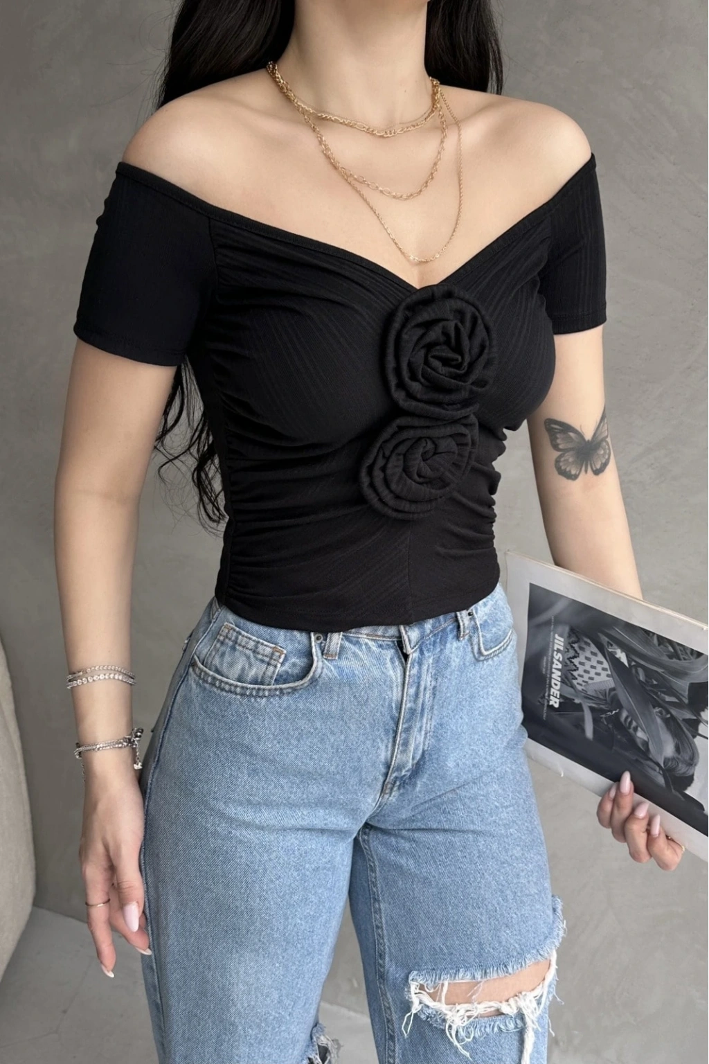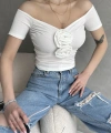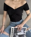 Ürün Adı :Kayık Yaka Gül Detaylı Crop Bluz