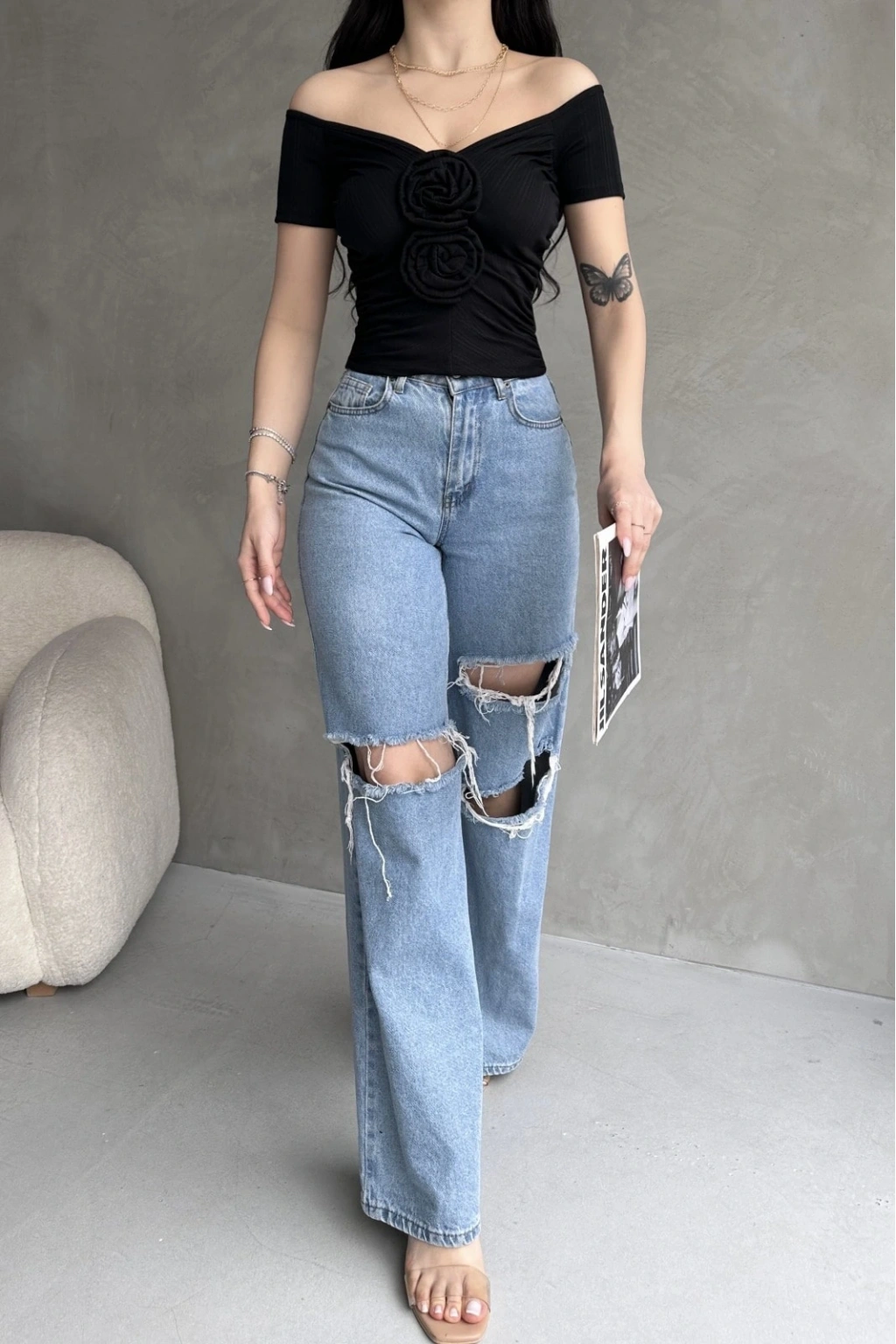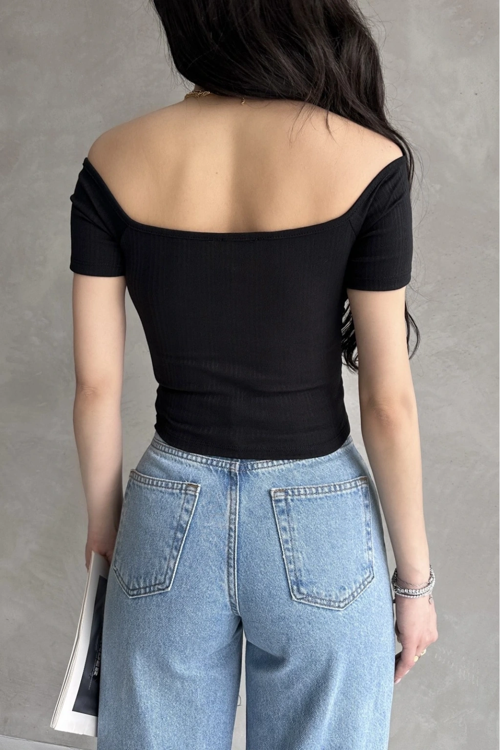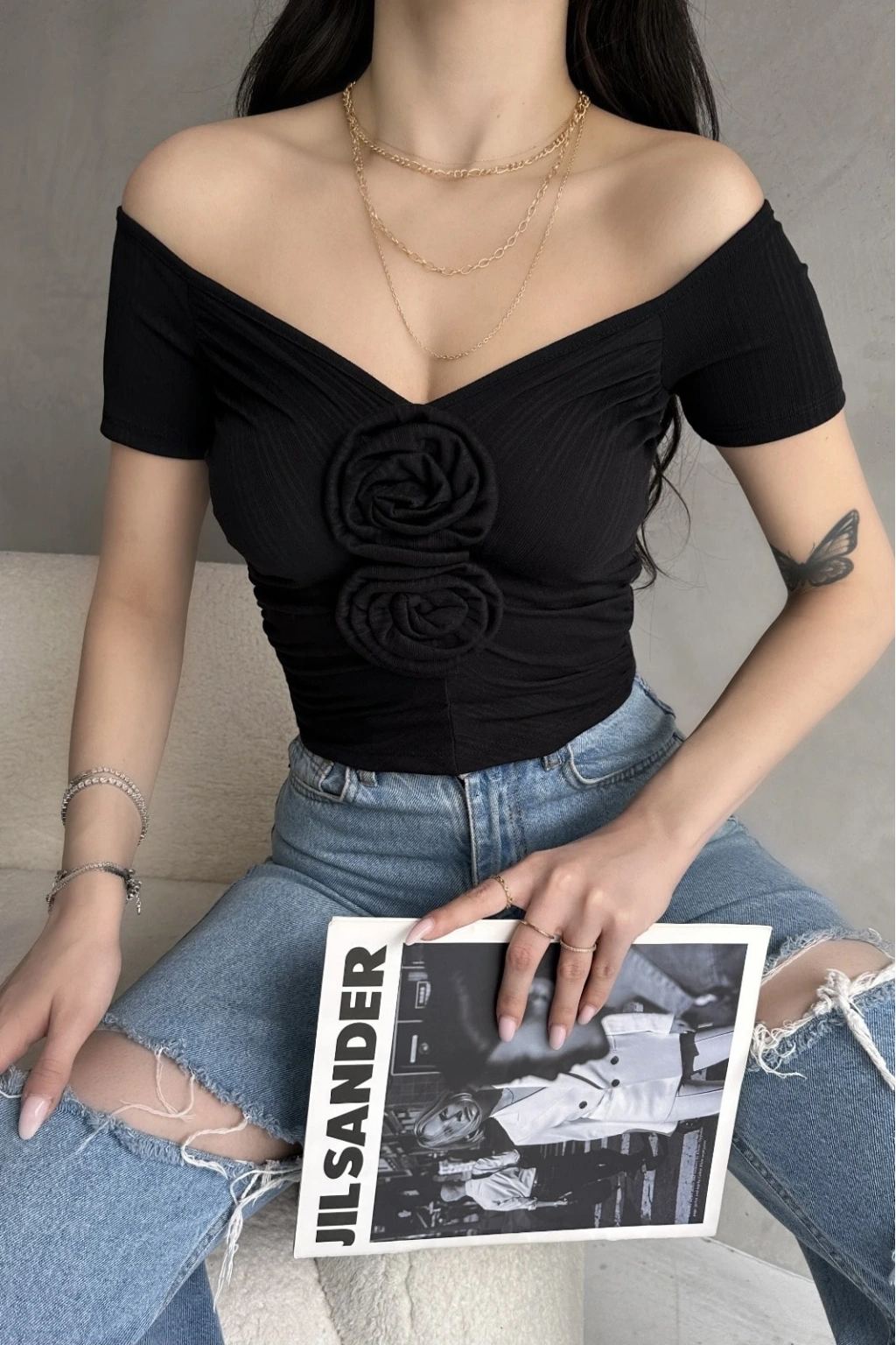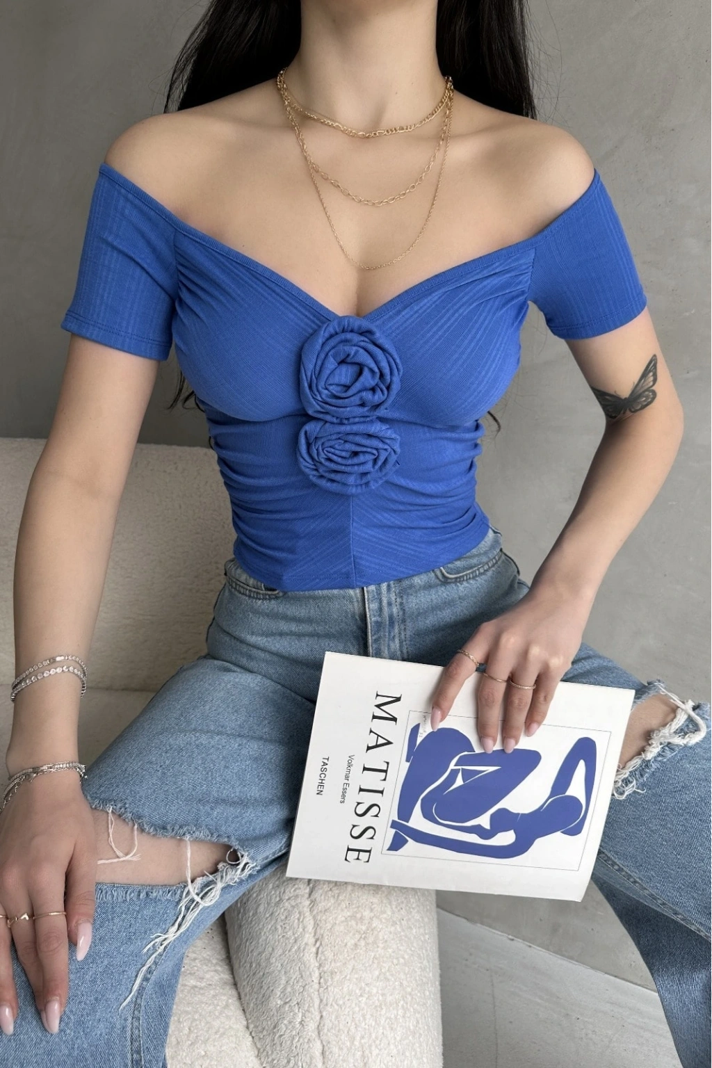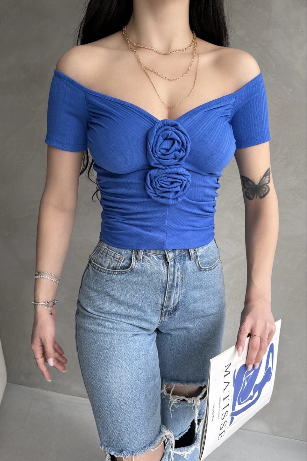 Ürün Adı :Kayık Yaka Gül Detaylı Crop Bluz