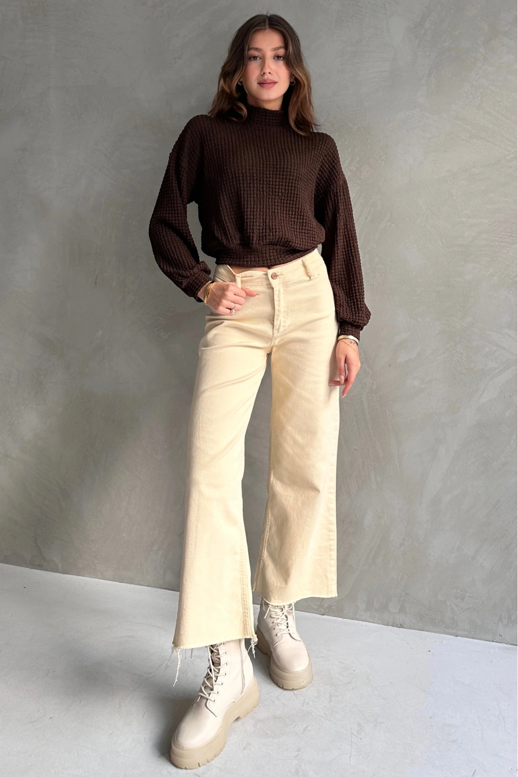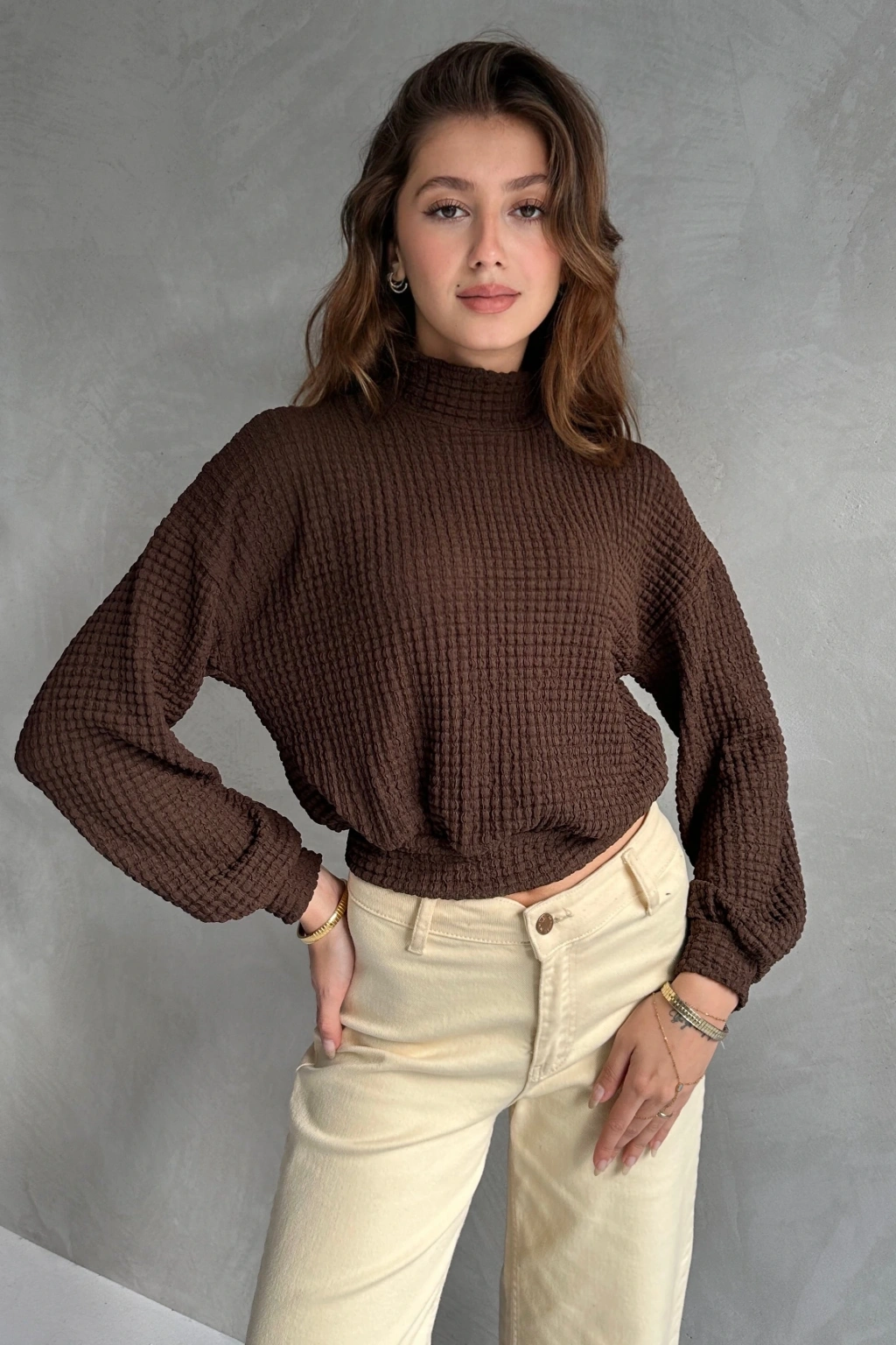 Pullaps Balıkçı Yaka Dokulu Crop Bluz Kahve