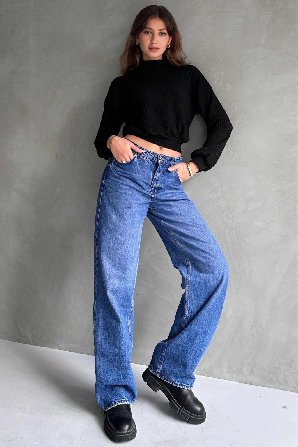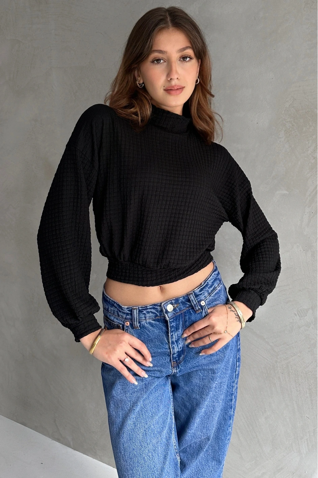 Pullaps Balıkçı Yaka Dokulu Crop Bluz Siyah