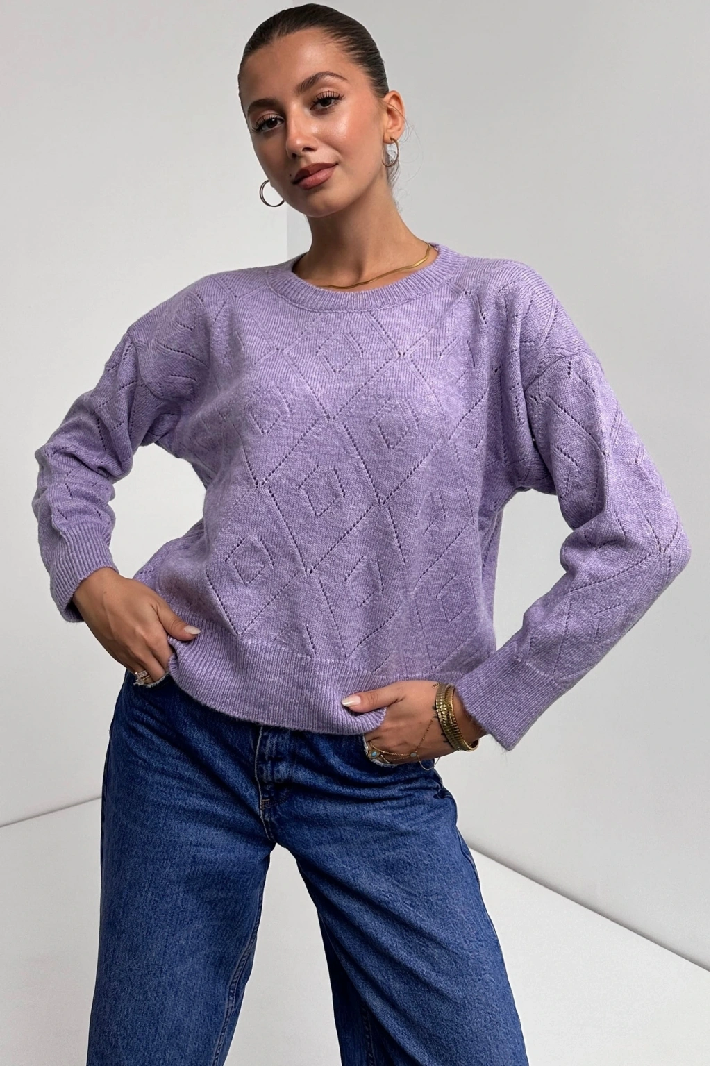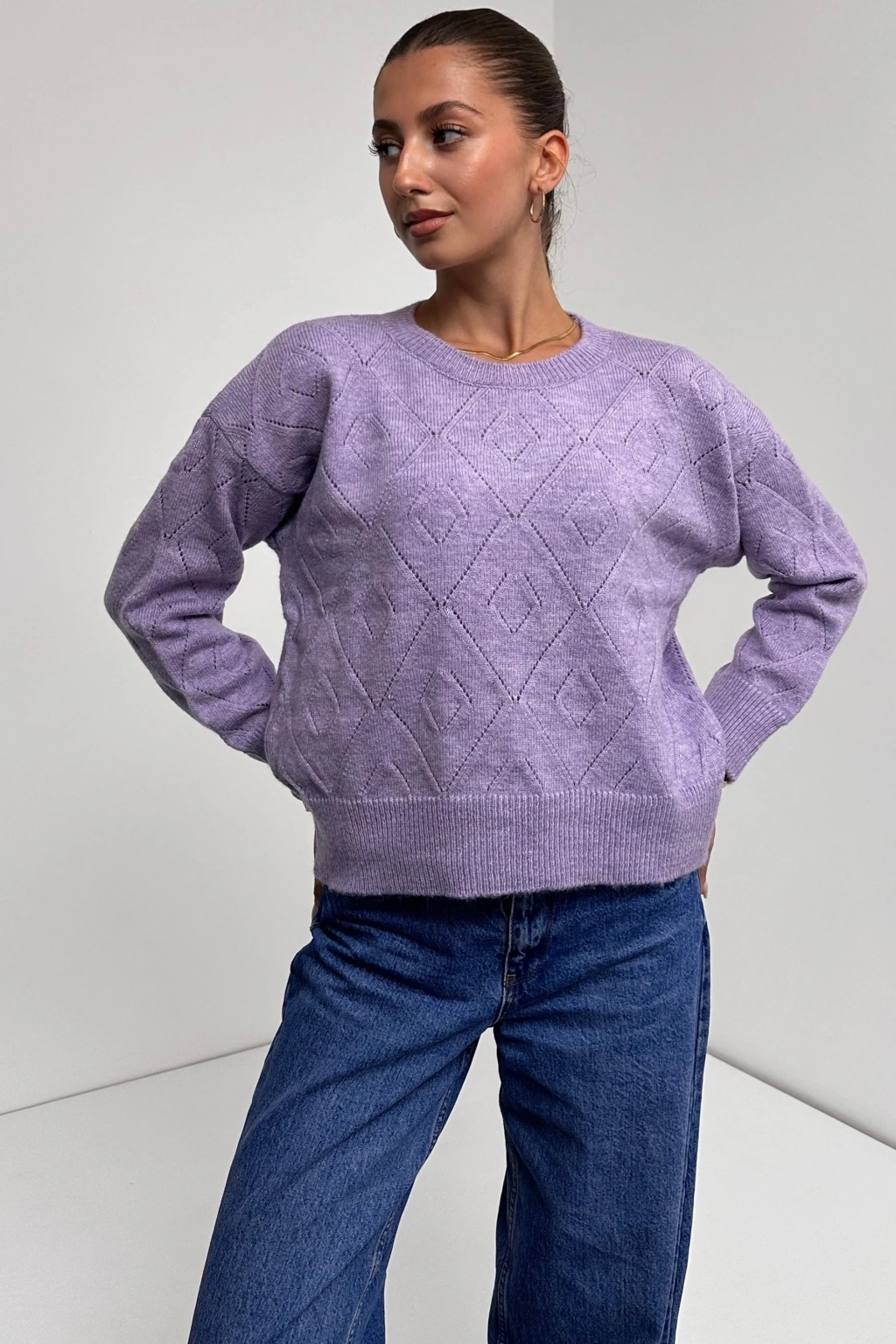 Pullaps Bisiklet Yaka Baklava Desenli Triko Kazak Lila