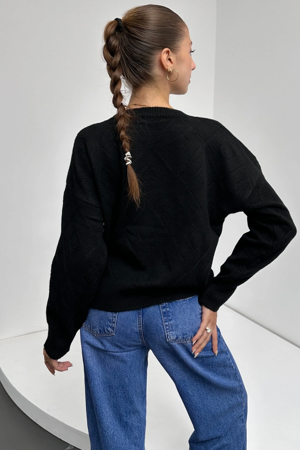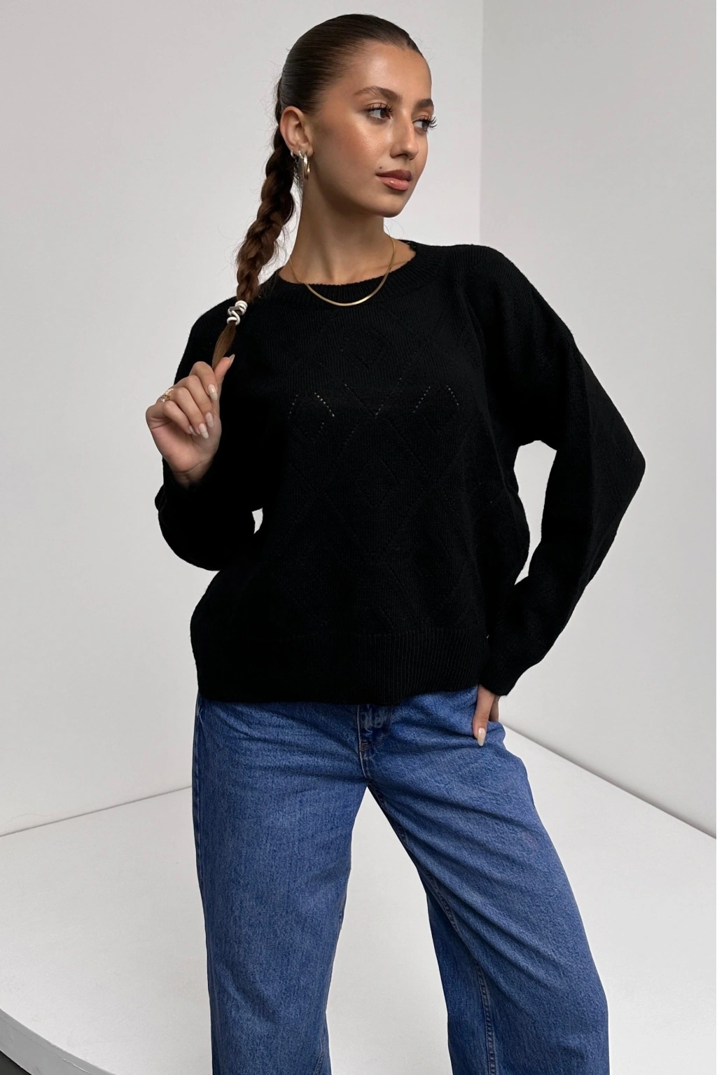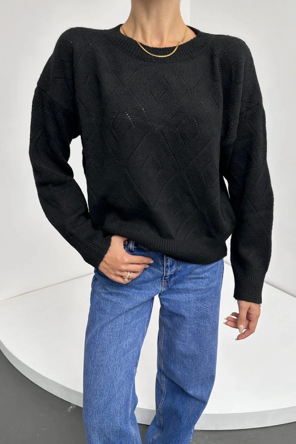 Pullaps Bisiklet Yaka Baklava Desenli Triko Kazak Siyah