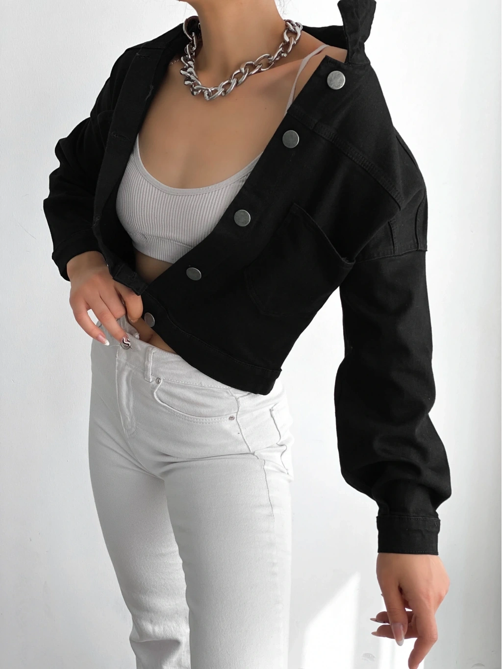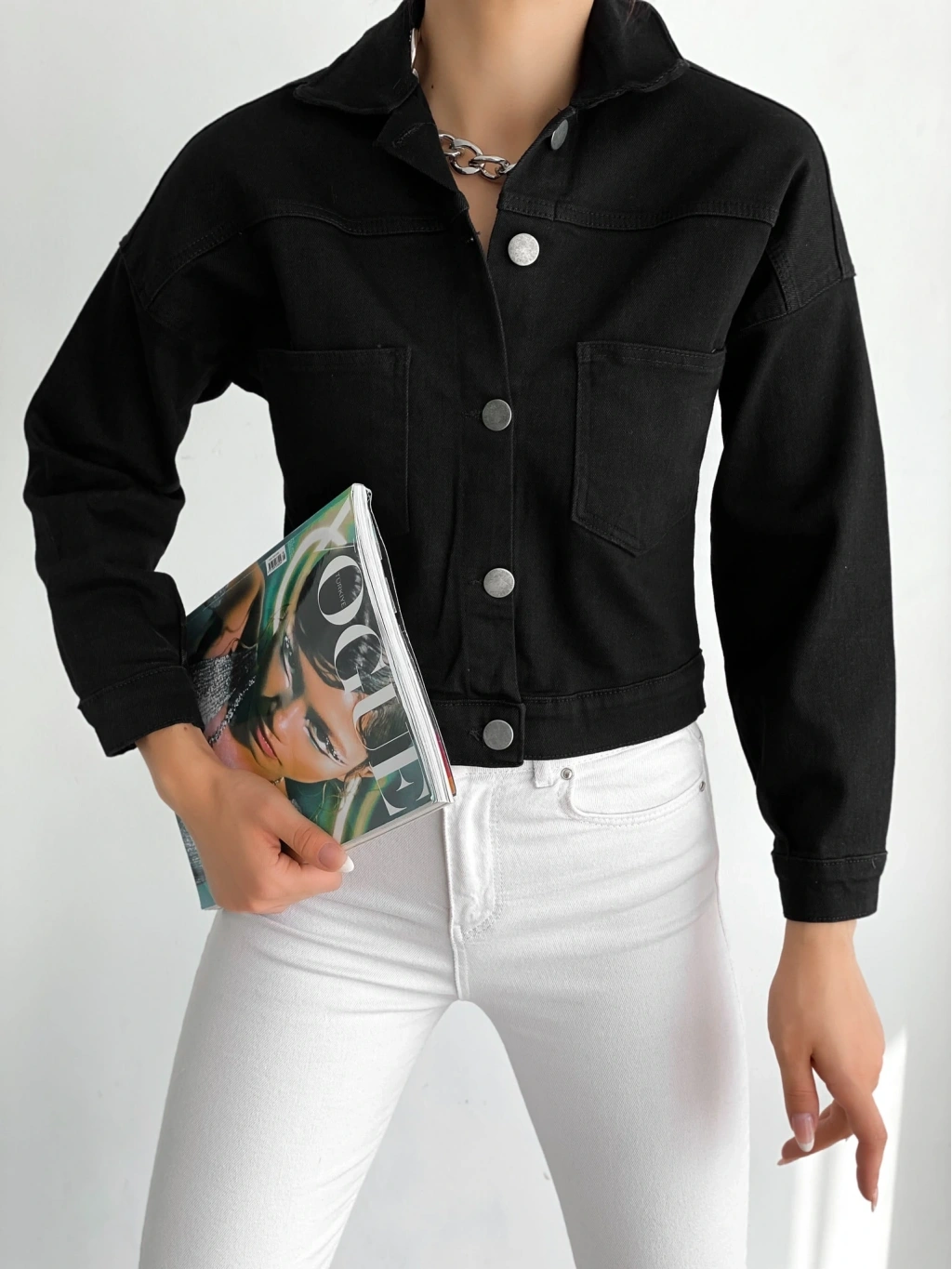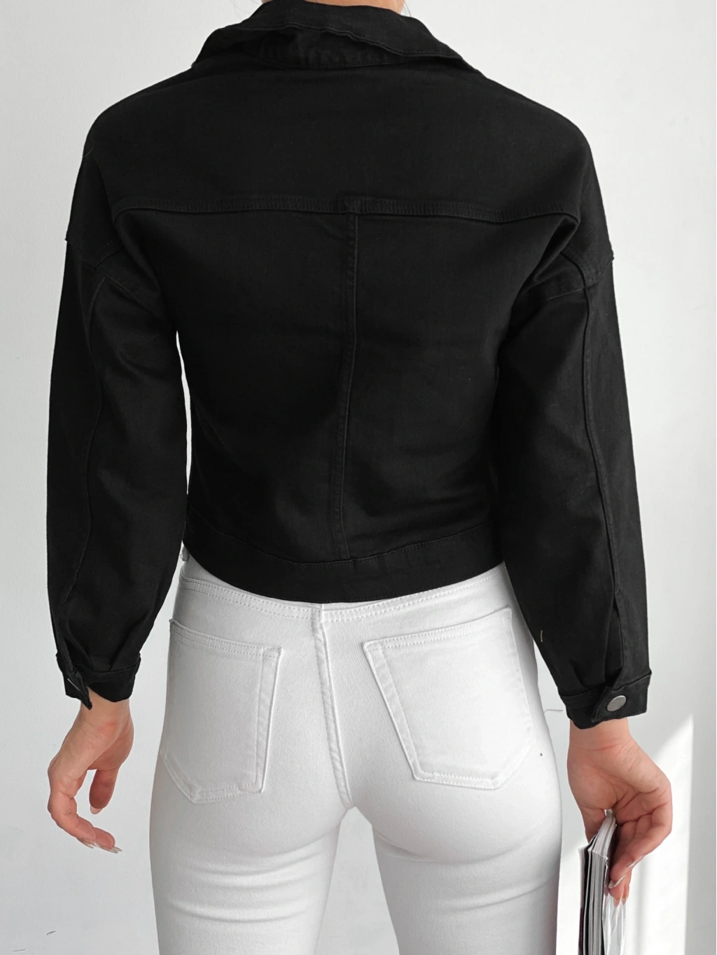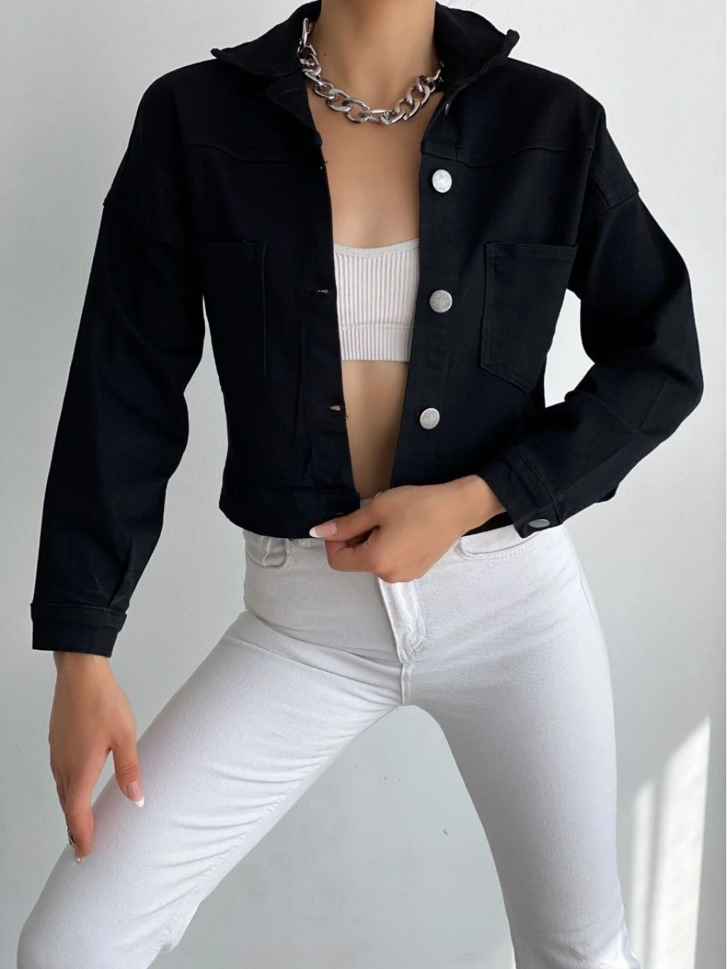 Pullaps Düz Cepli Denim Crop Ceket Siyah