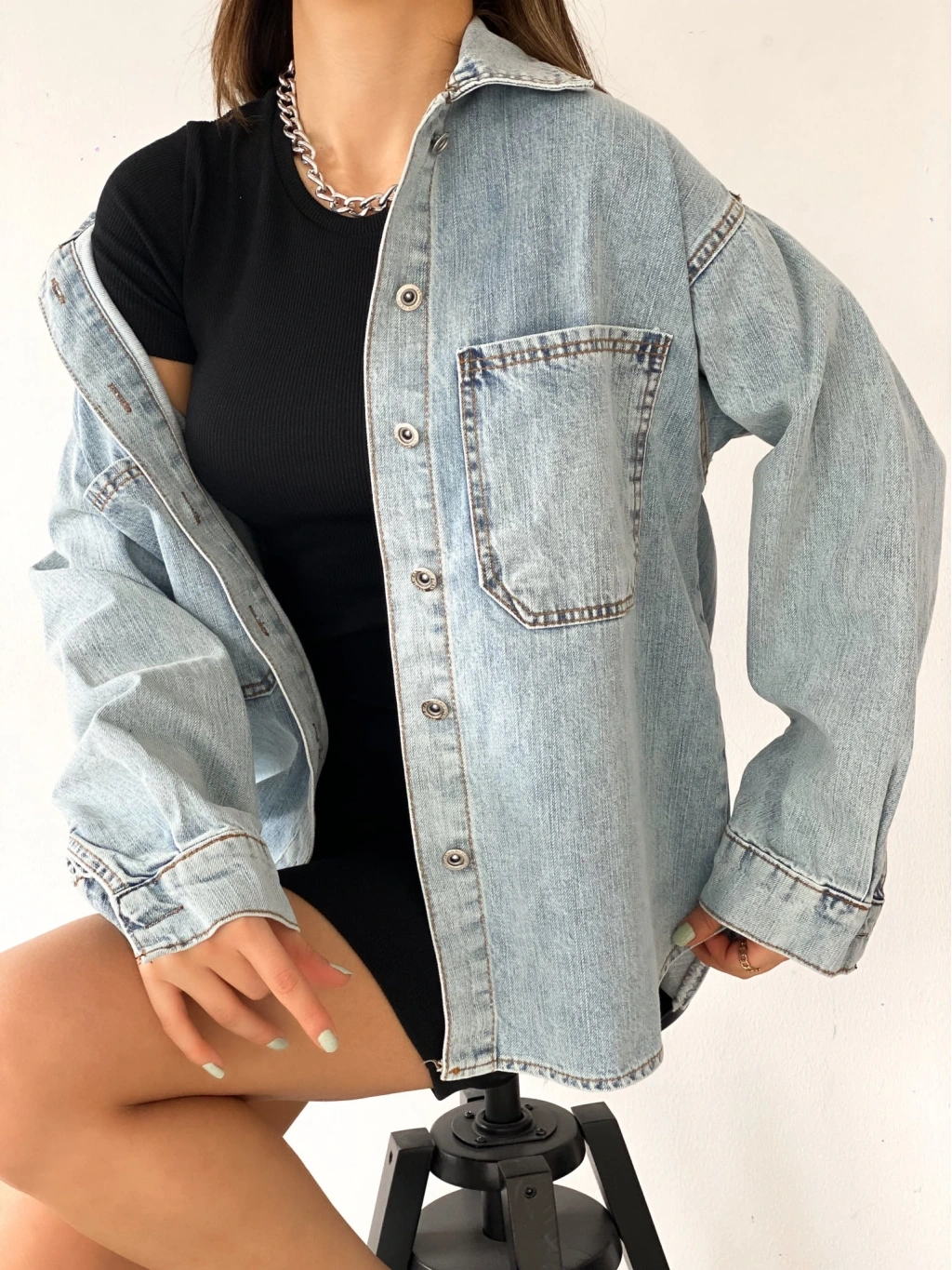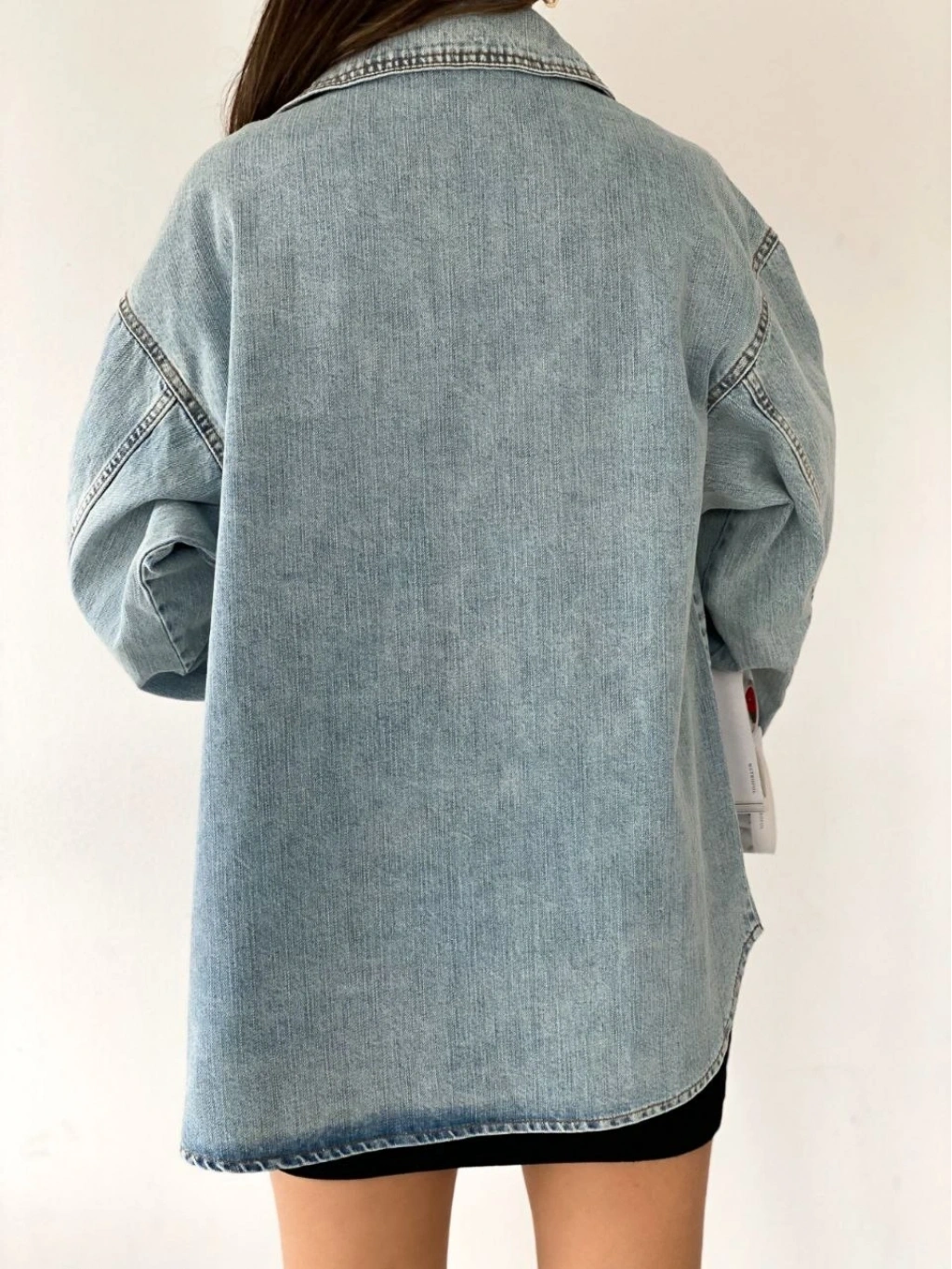 Modayı yakından takip edenlerin favorisi: Çift Cepli Oversize Denim Gömlek Ceket! Gömlek rahatlığını ceket şıklığıyla birleştiren bu çok yönlü parça, gardırobunuzun en kullanışlı ürünü olacak. Oversize jean ceket kalıbı, katmanlı giyim için mükemmel bir seçenek sunarken, klasik denim dokusu her kombine uyum sağlar.