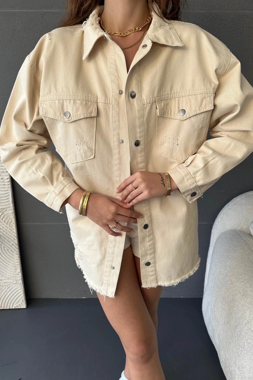 Pullaps Çift Cepli Yırtık Detaylı Oversize Gömlek Ceket Bej