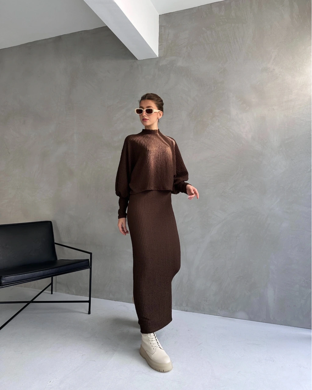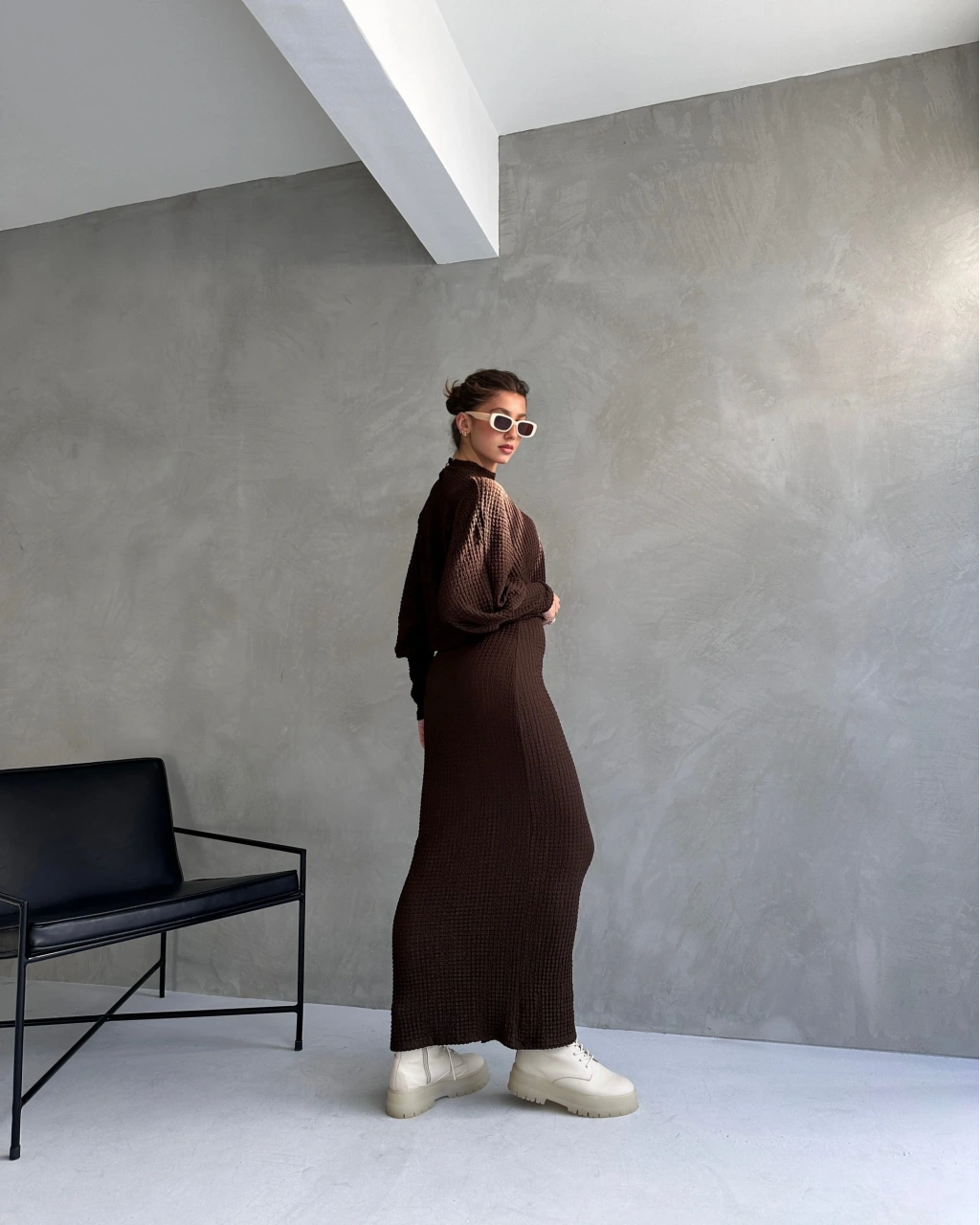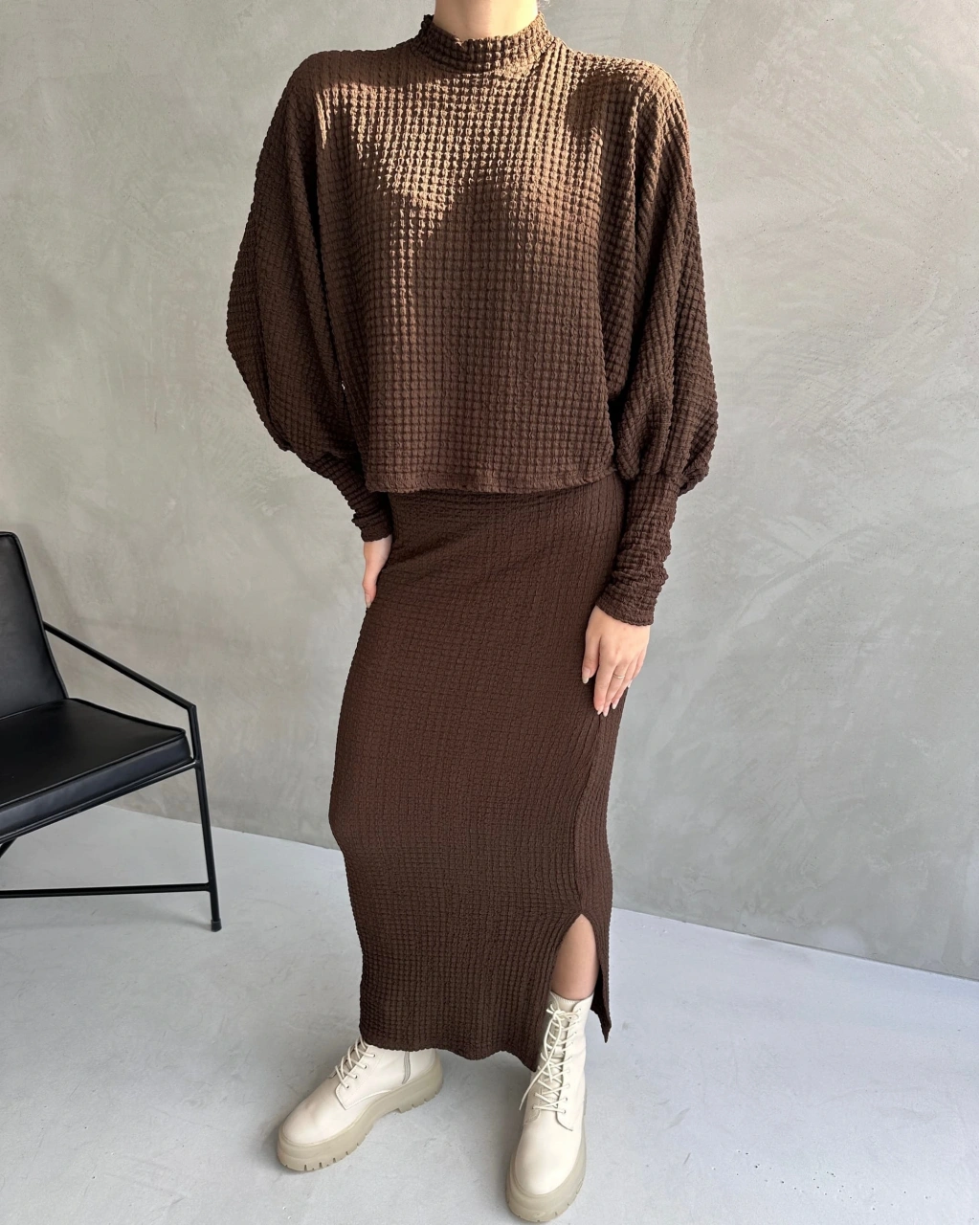 Dokulu yırtmaç detaylı etek ve bluz 2'li takım ile tanışın! Bu şık ikili takım, zahmetsiz şıklık arayan kadınlar için tasarlandı. Dokulu kumaşının kazandırdığı kaliteli duruş ve etek yırtmaç detayının sunduğu feminen hava ile tüm dikkatleri üzerinize çekin. Tek bir parça ile hem ofis şıklığını hem de özel davetlerin zarafetini yakalayın.