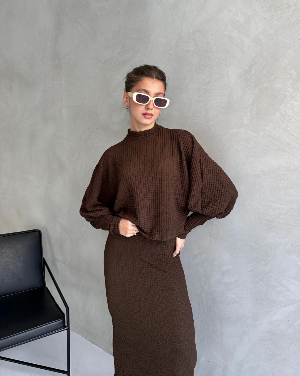 Zahmetsiz Şıklık: Bluz ve eteğin uyumu sayesinde kolayca kombinlenir ve her zaman şık görünmenizi sağlar.
