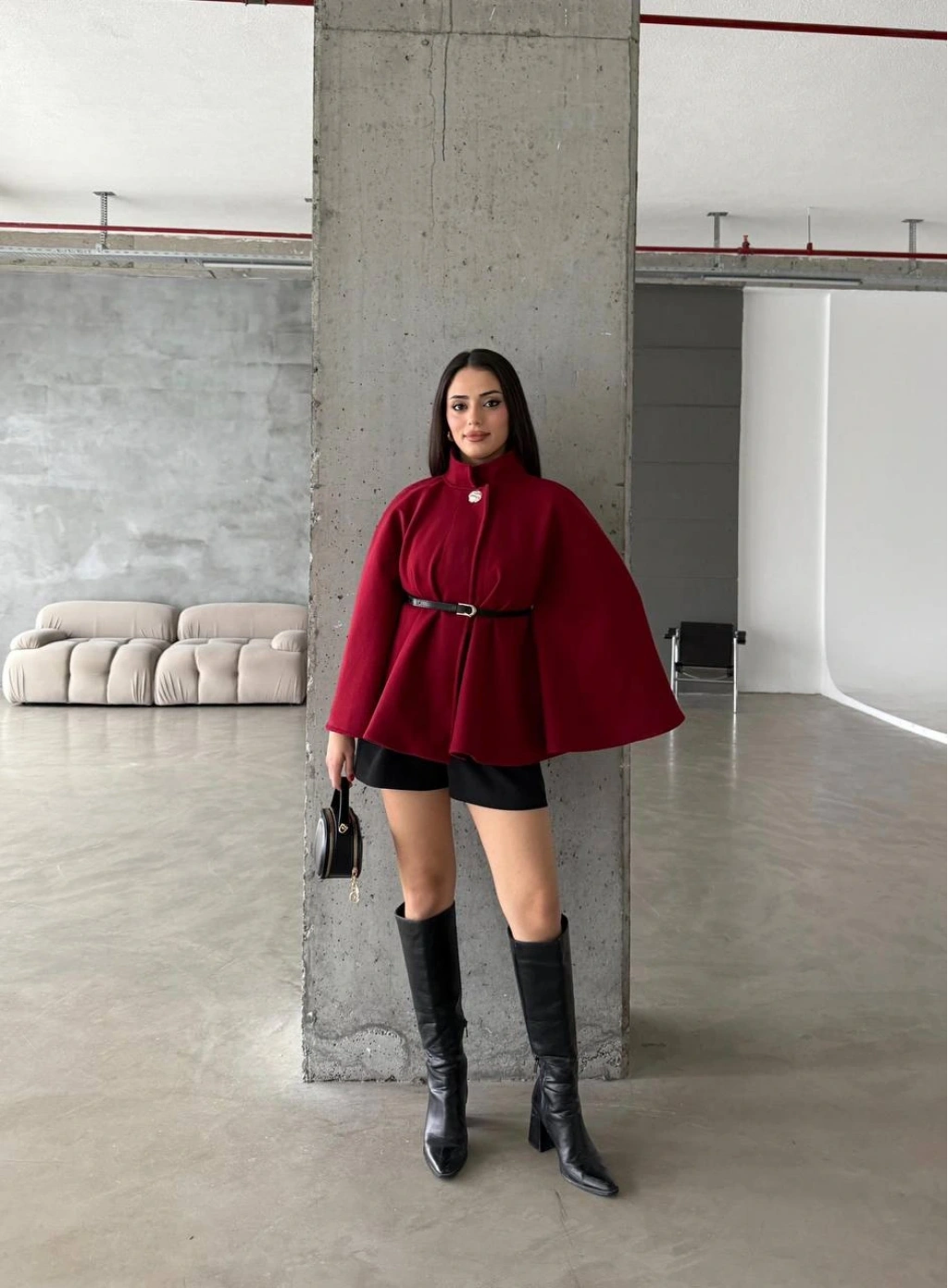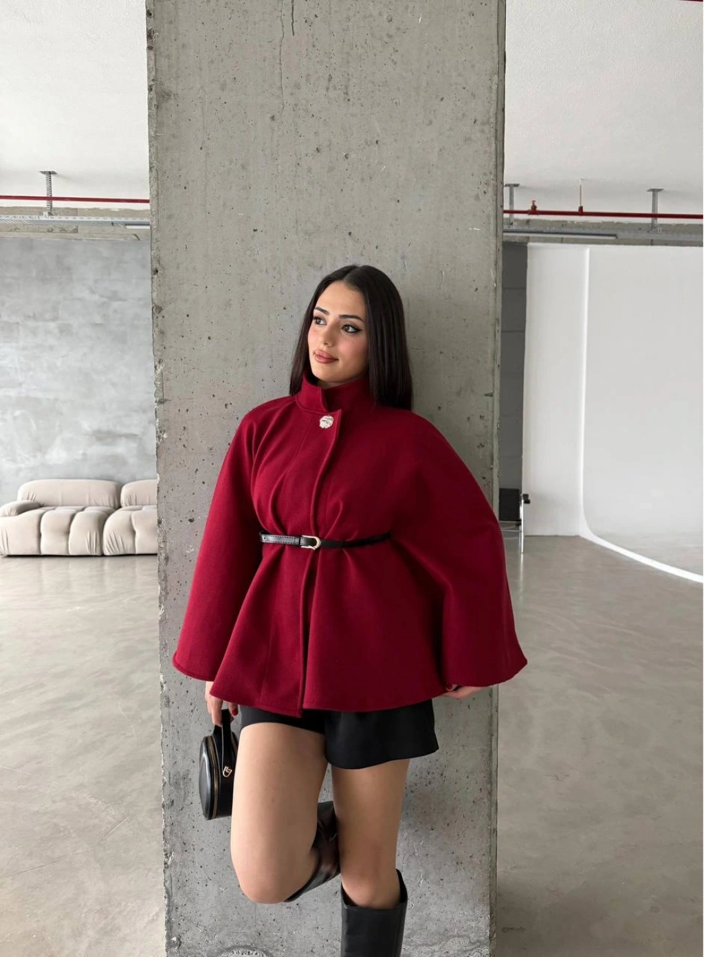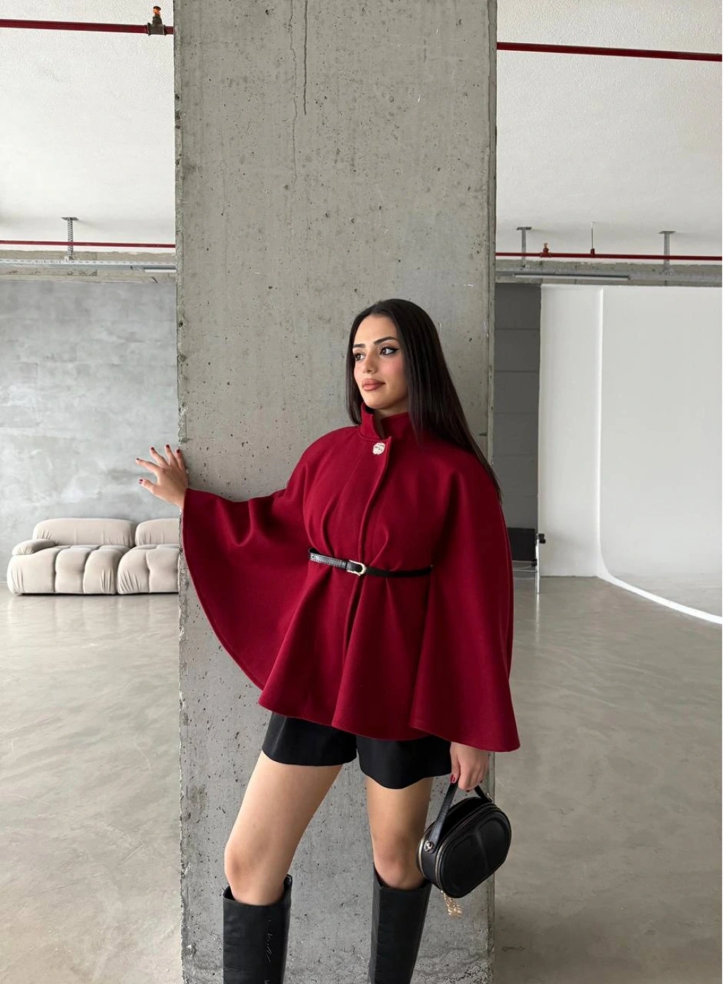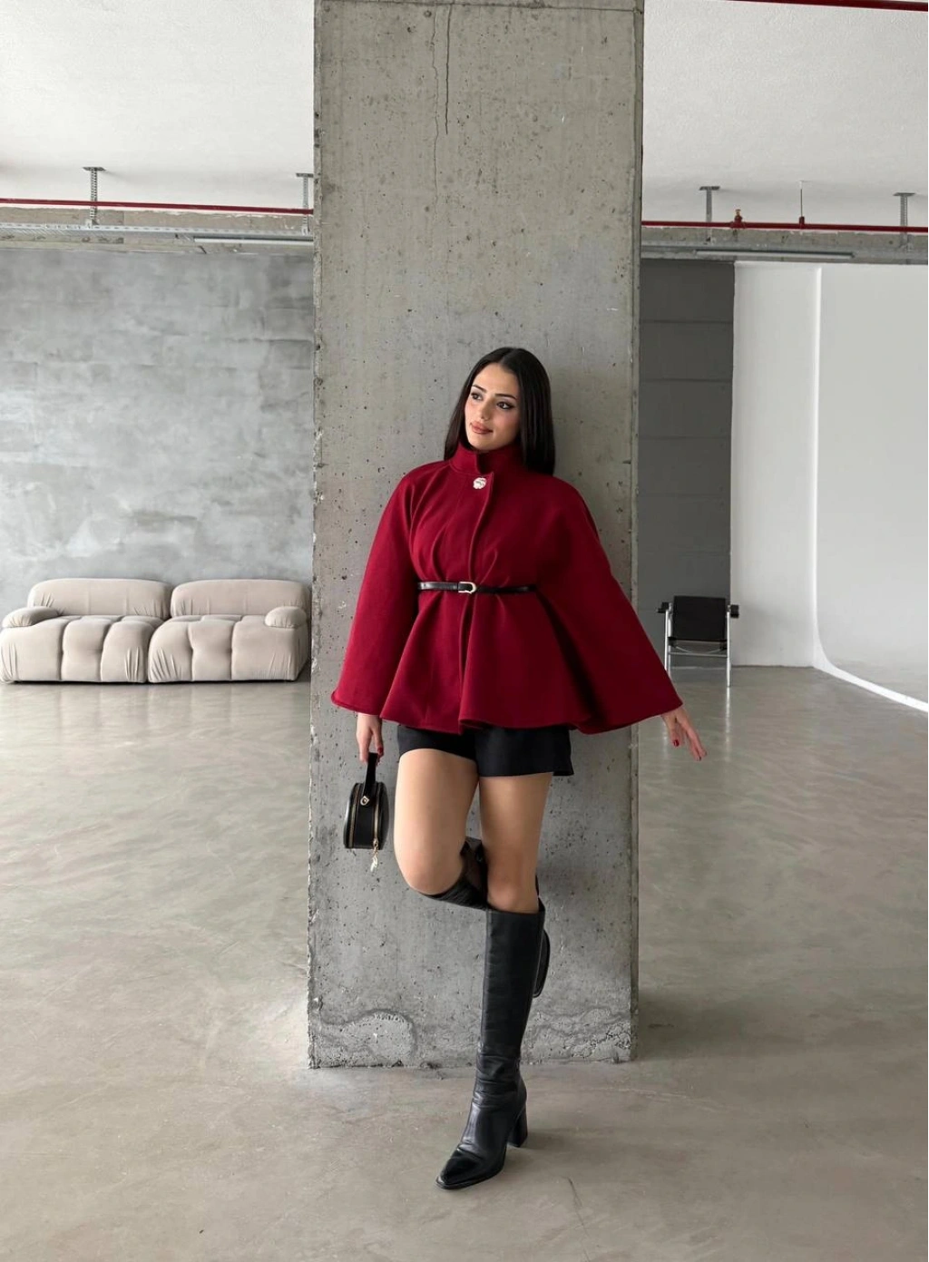 Pullaps Düğme Detaylı Kemerli Kaşe Panço Bordo