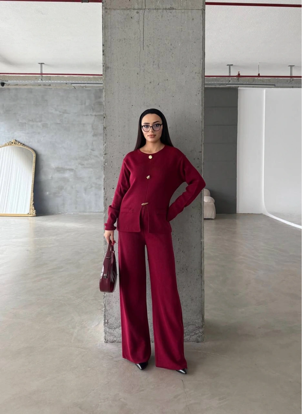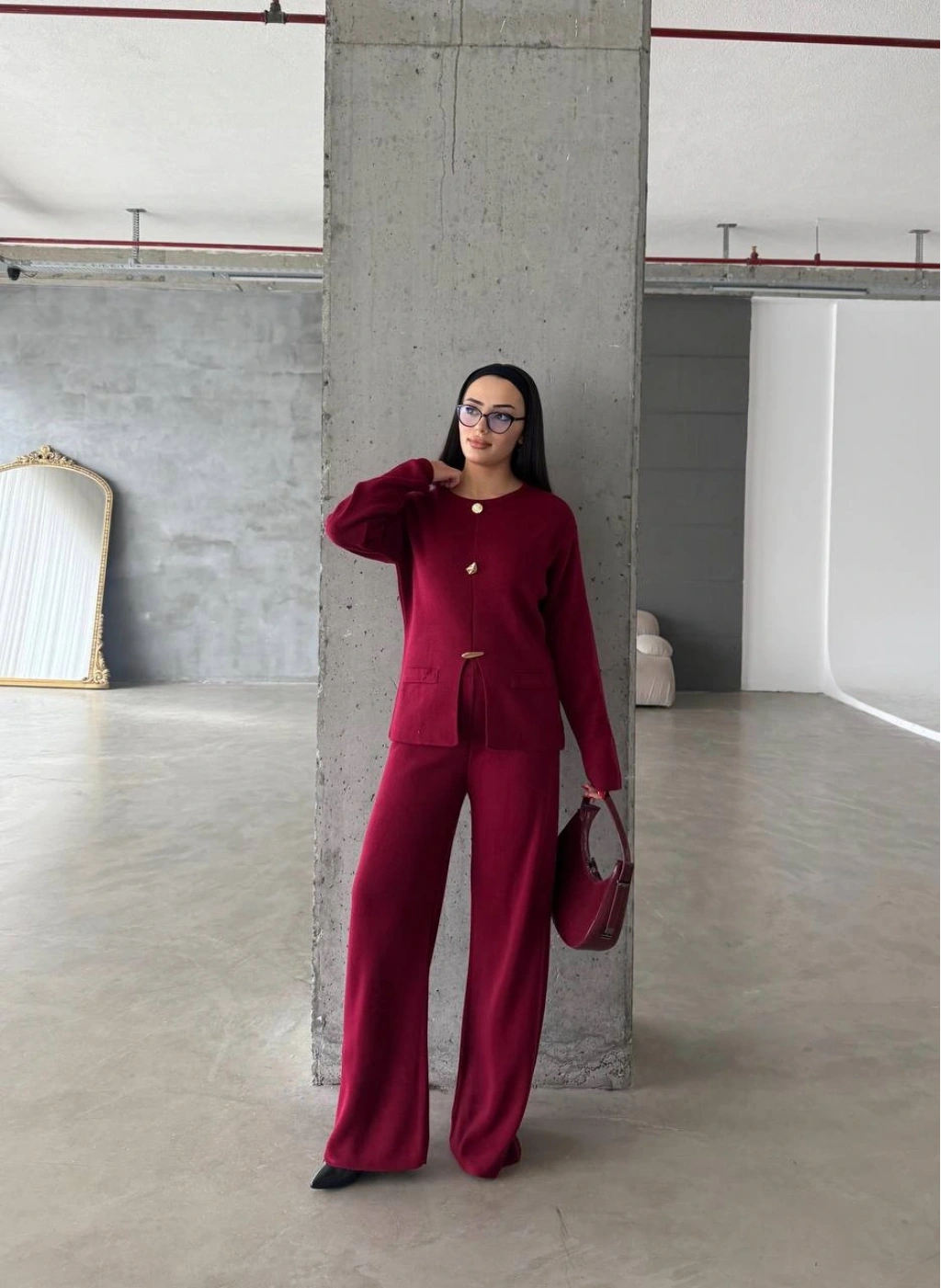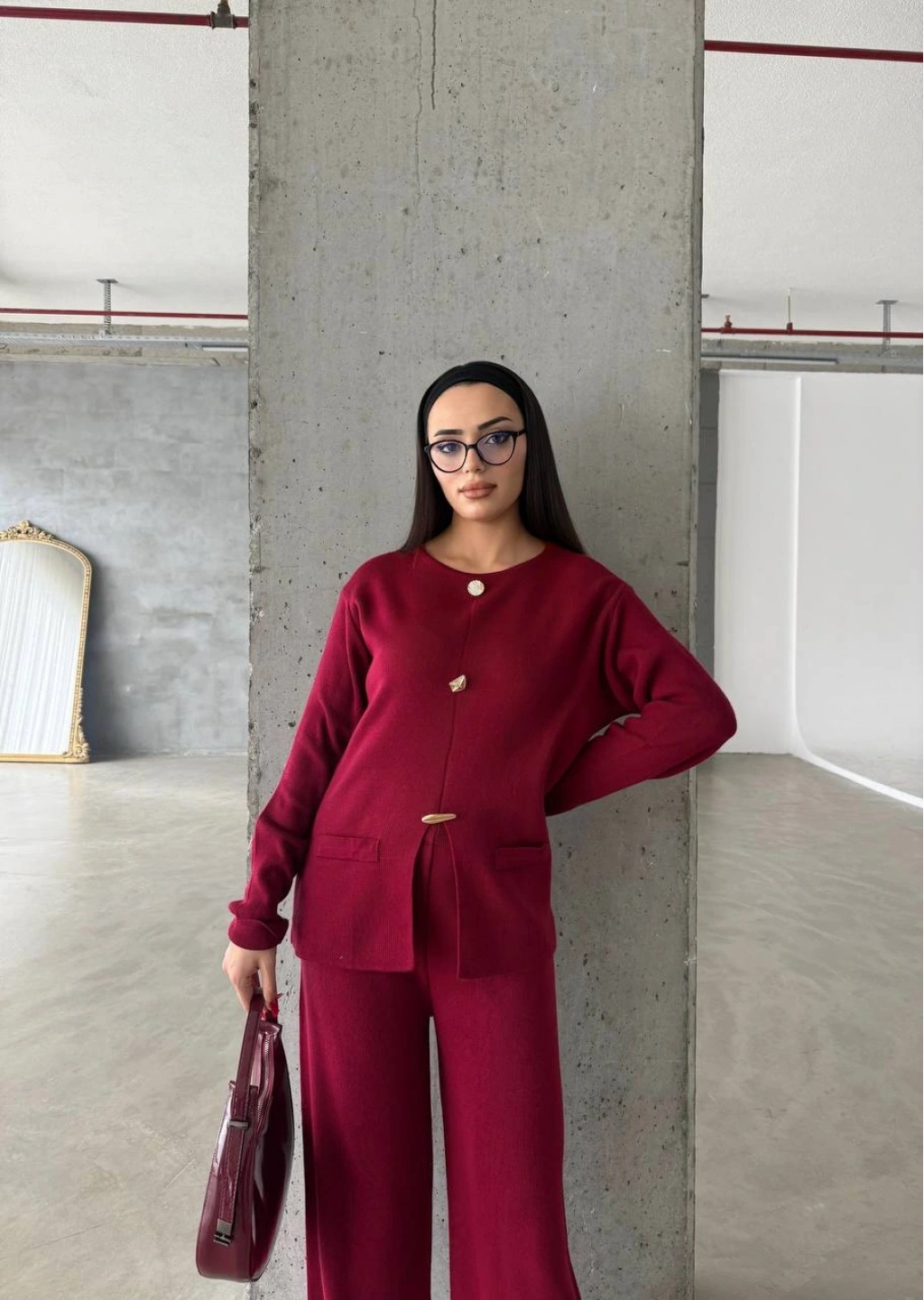 Pullaps Düğme Detaylı Triko Takım Bordo
