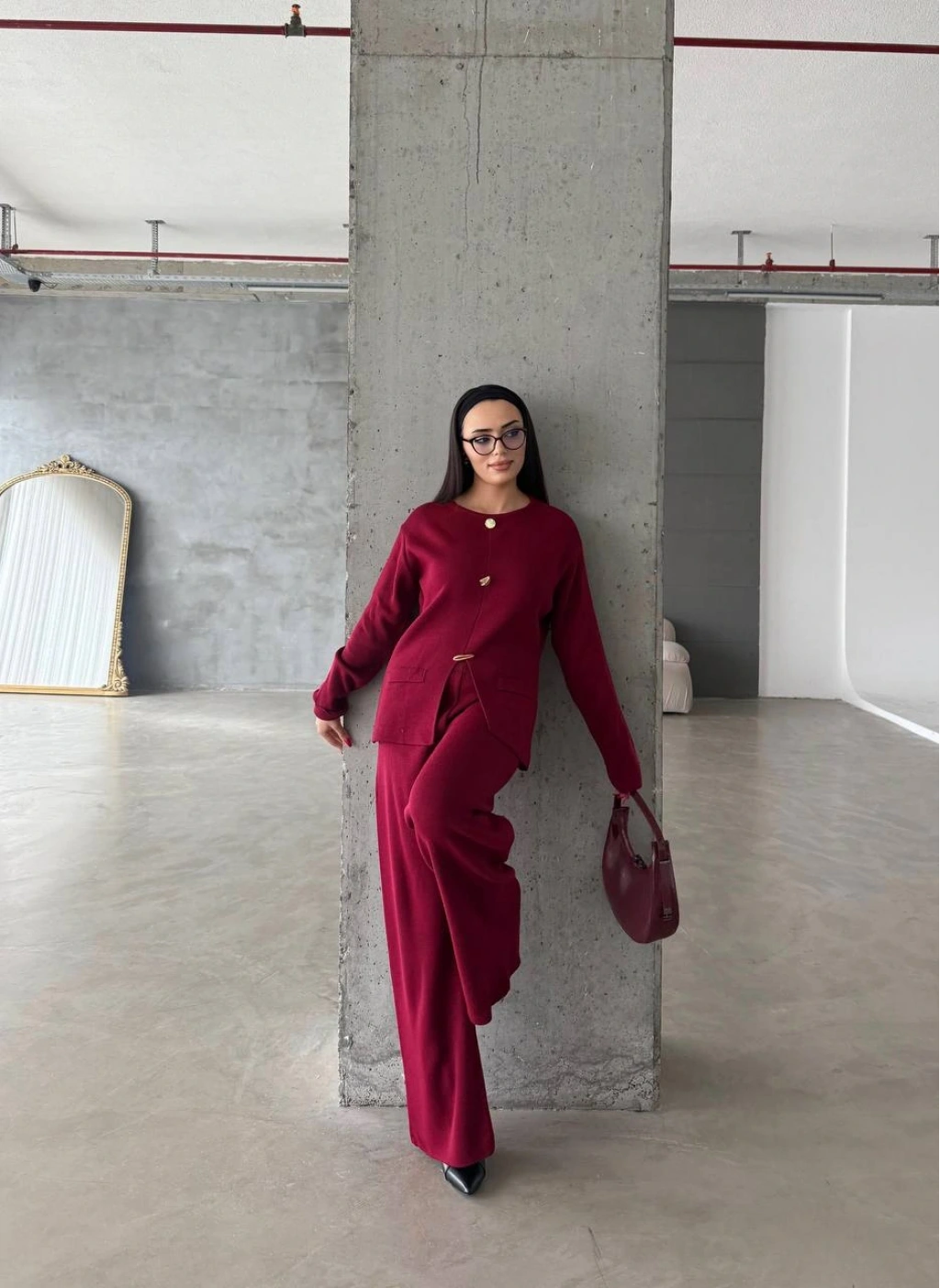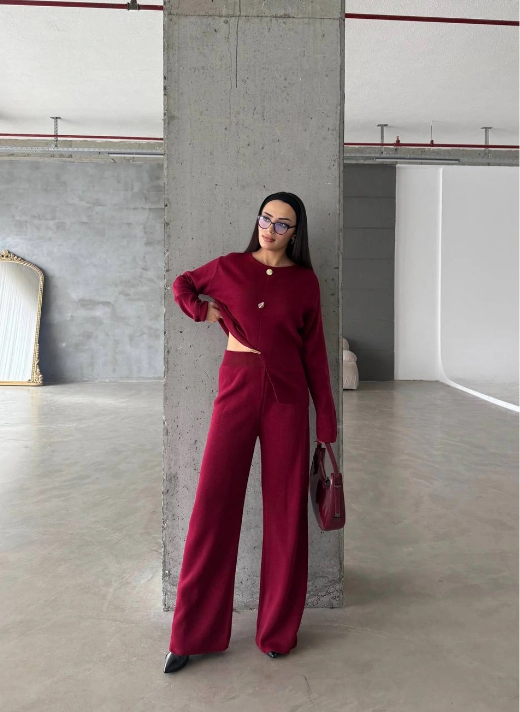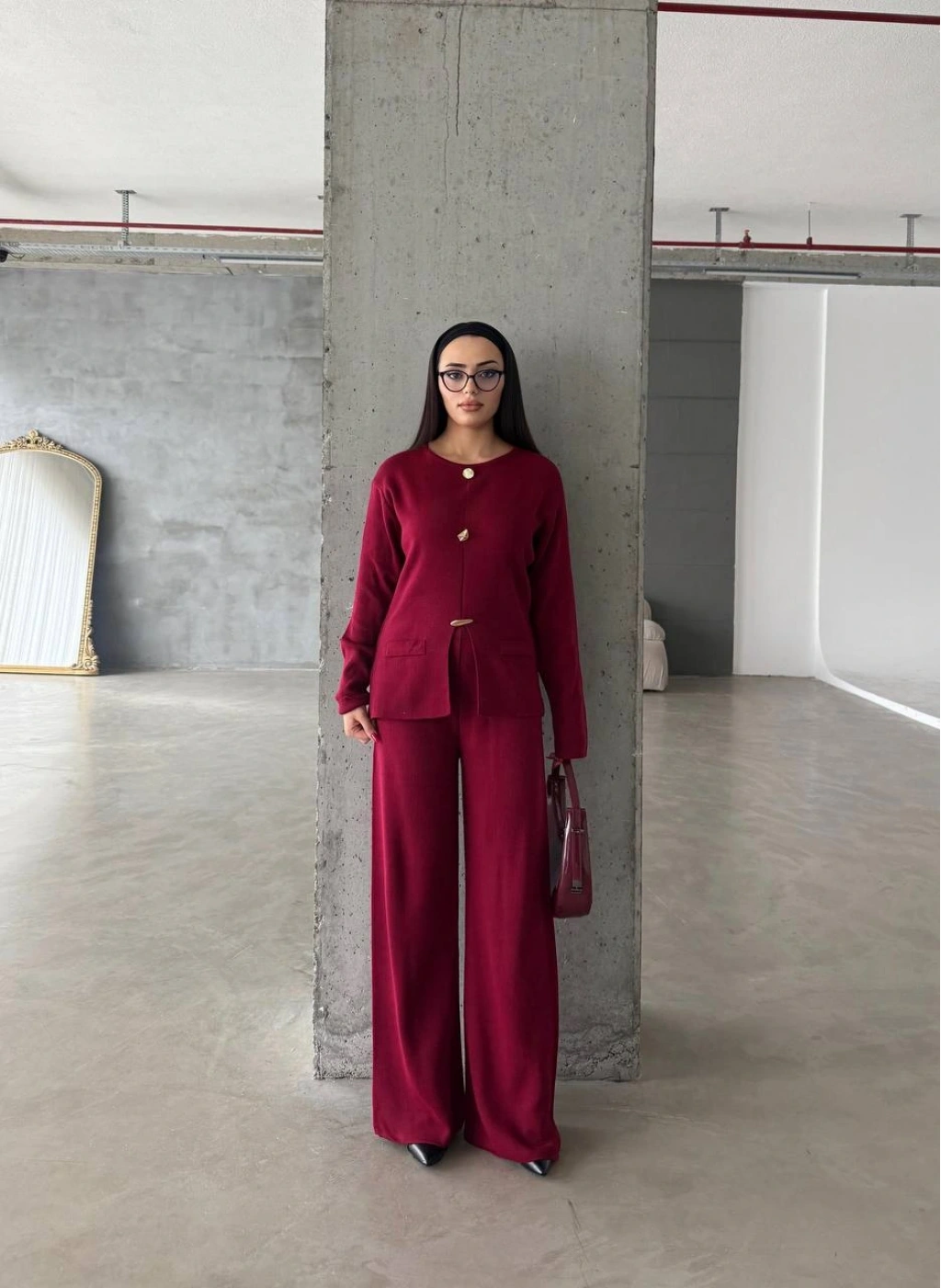 Pullaps Düğme Detaylı Triko Takım Bordo