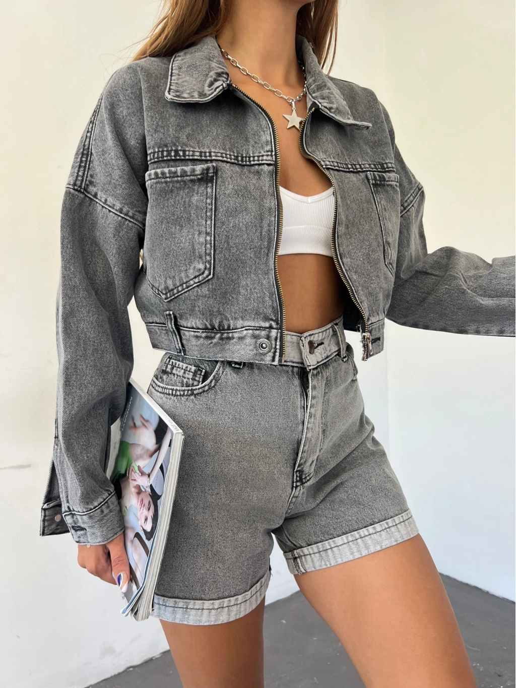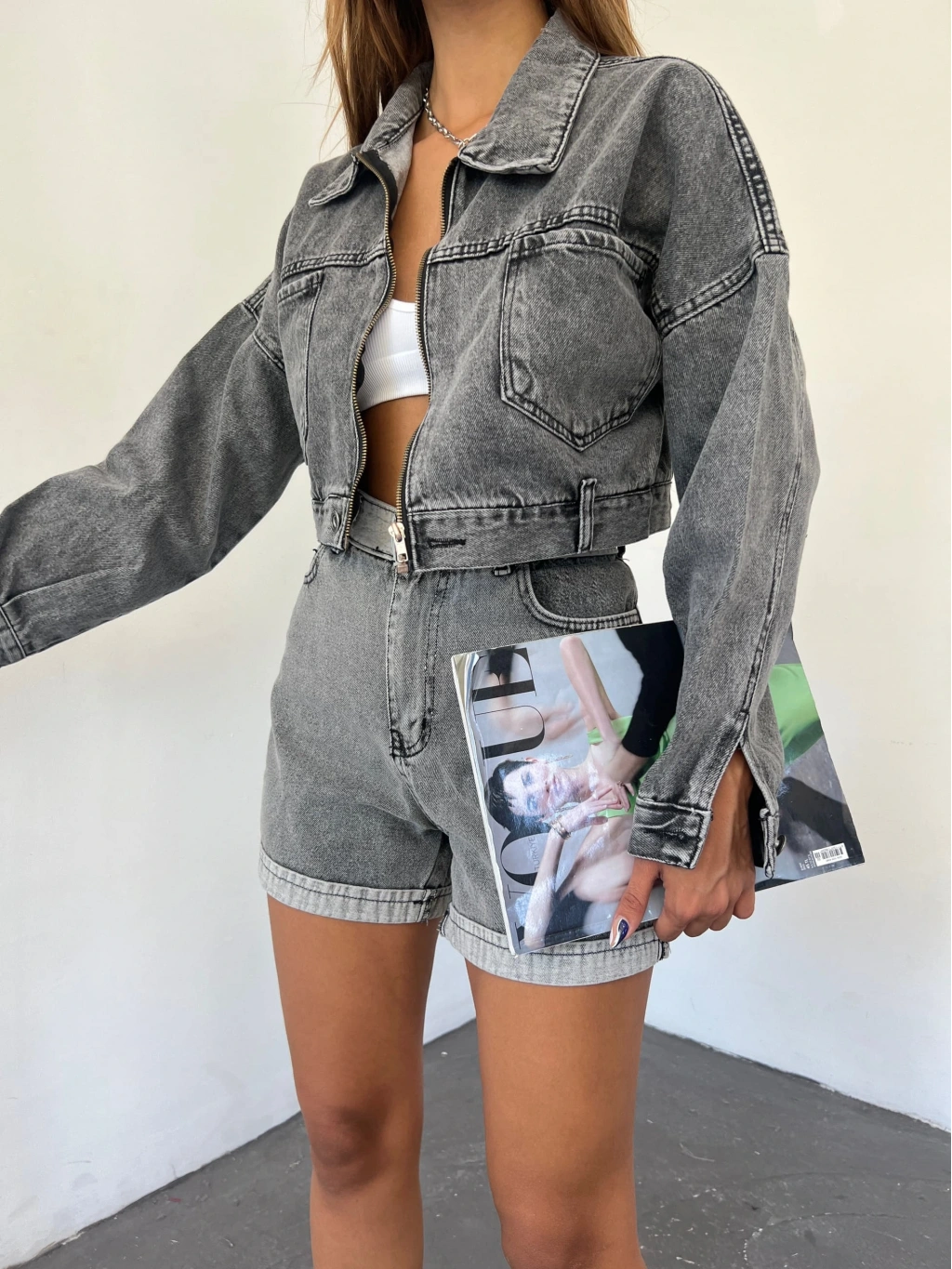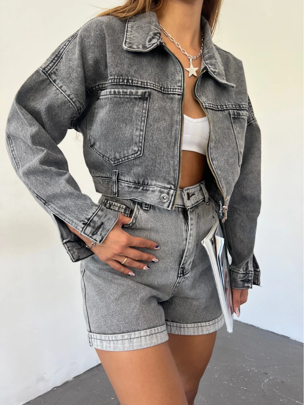Pullaps Fermuarlı Çift Cepli Kot Mont Antrasit
