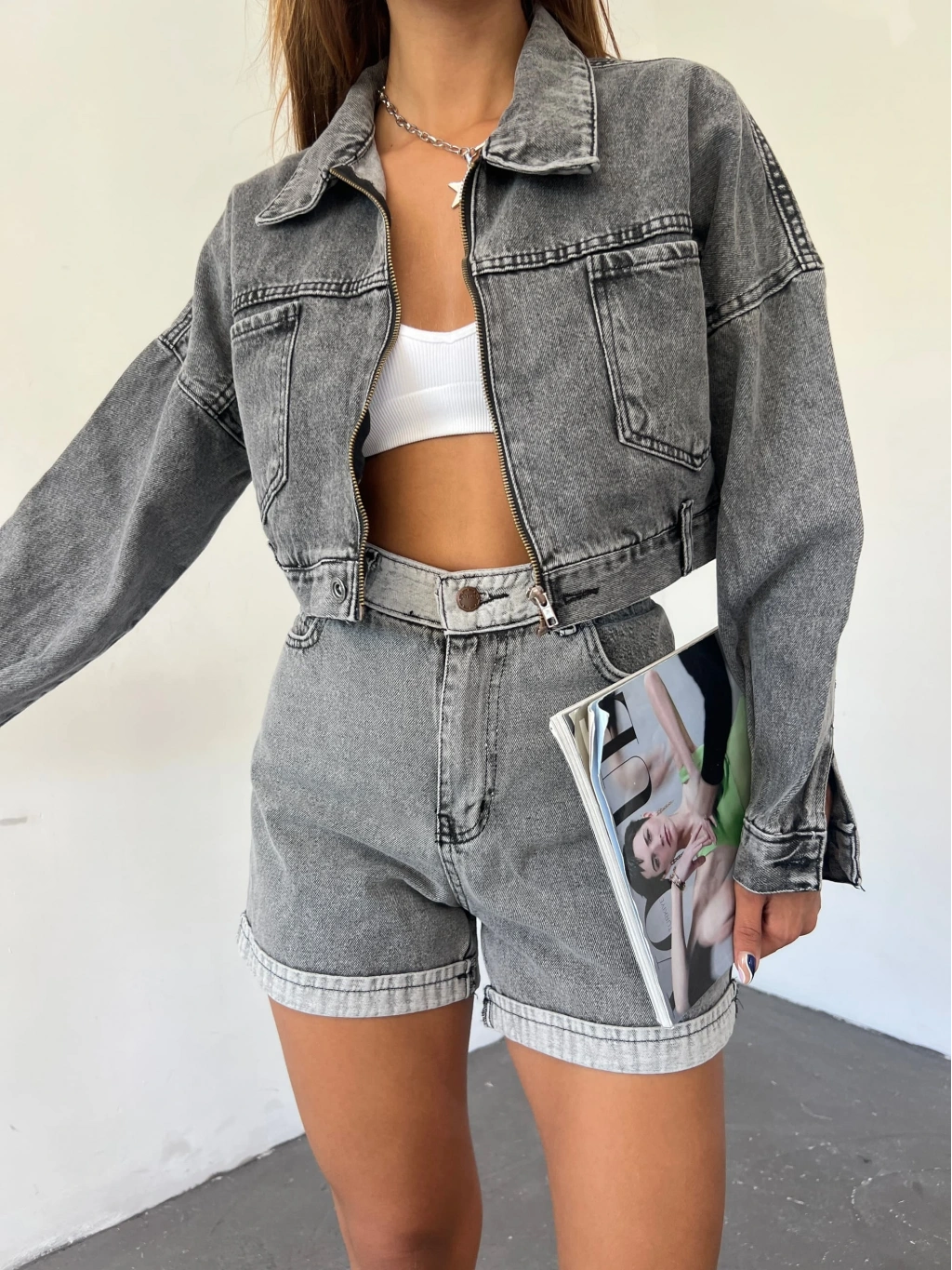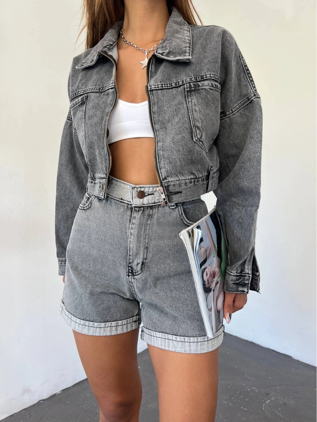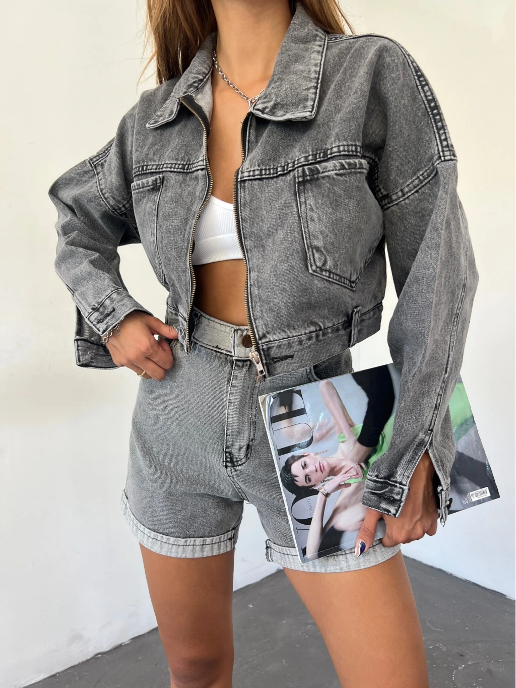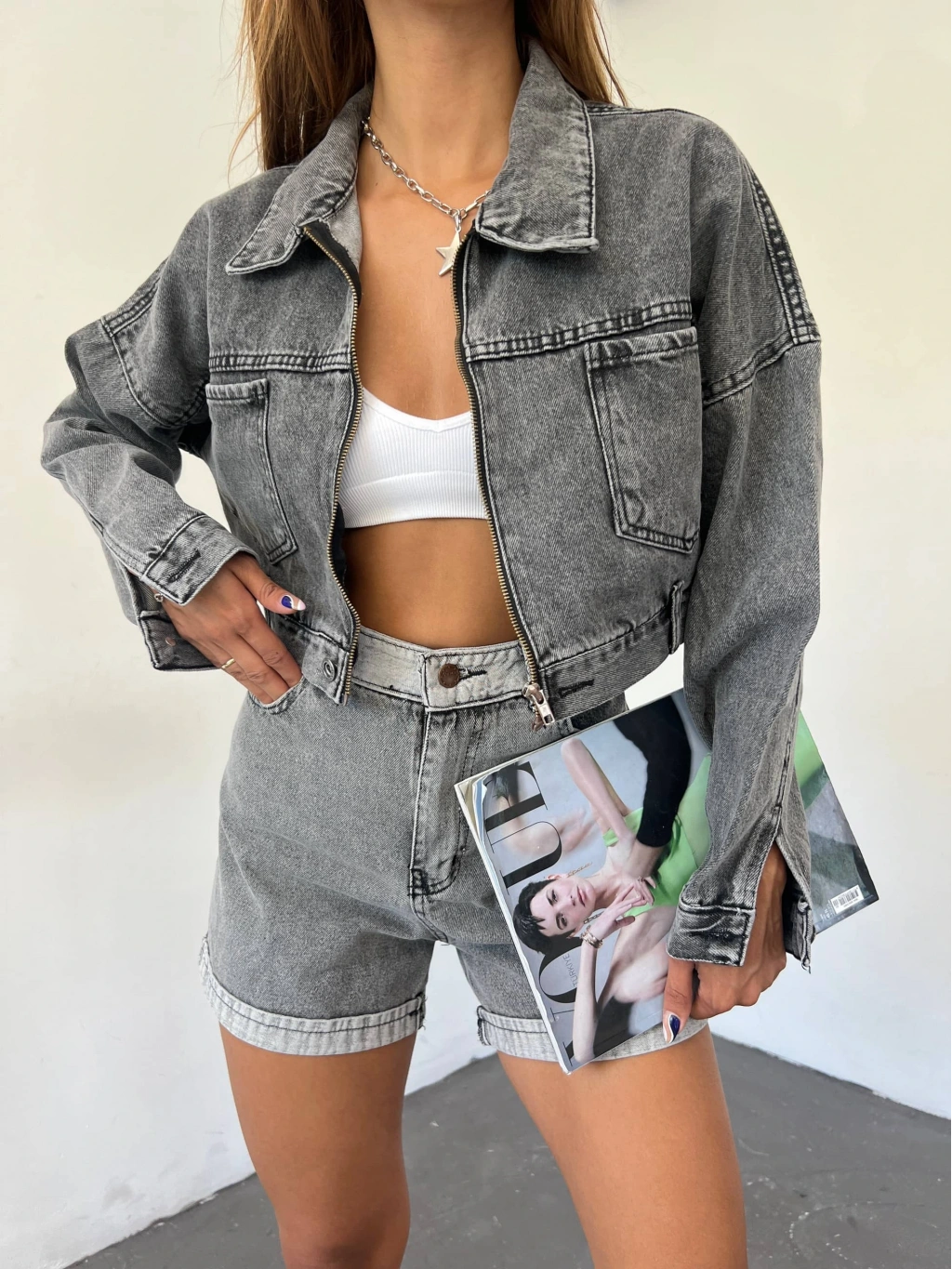Pullaps Fermuarlı Çift Cepli Kot Mont Antrasit