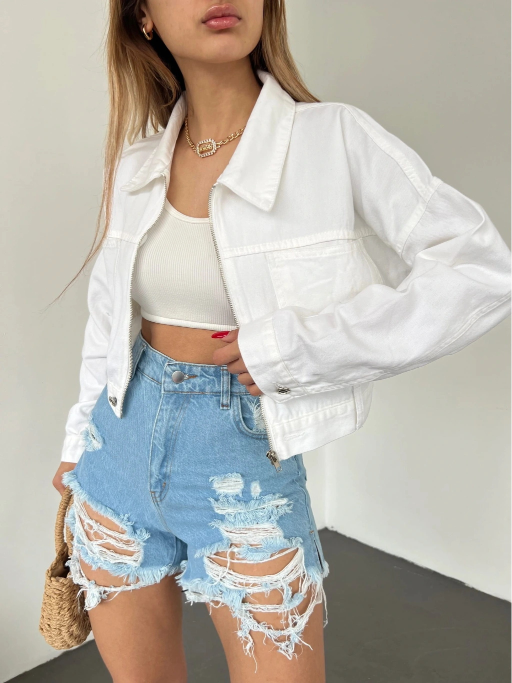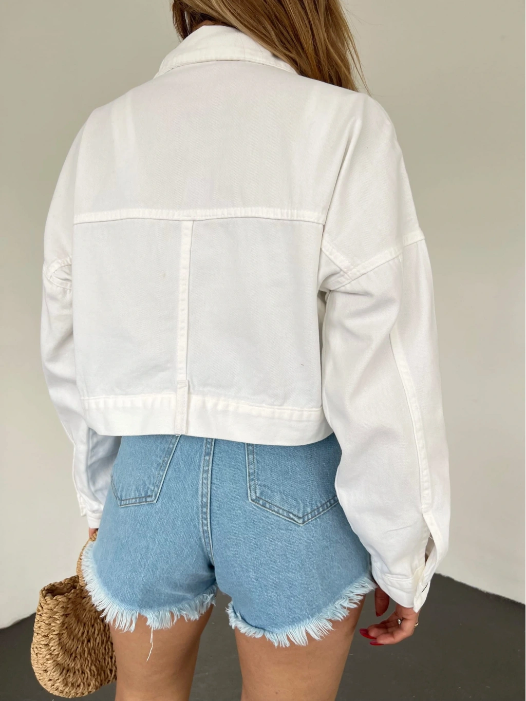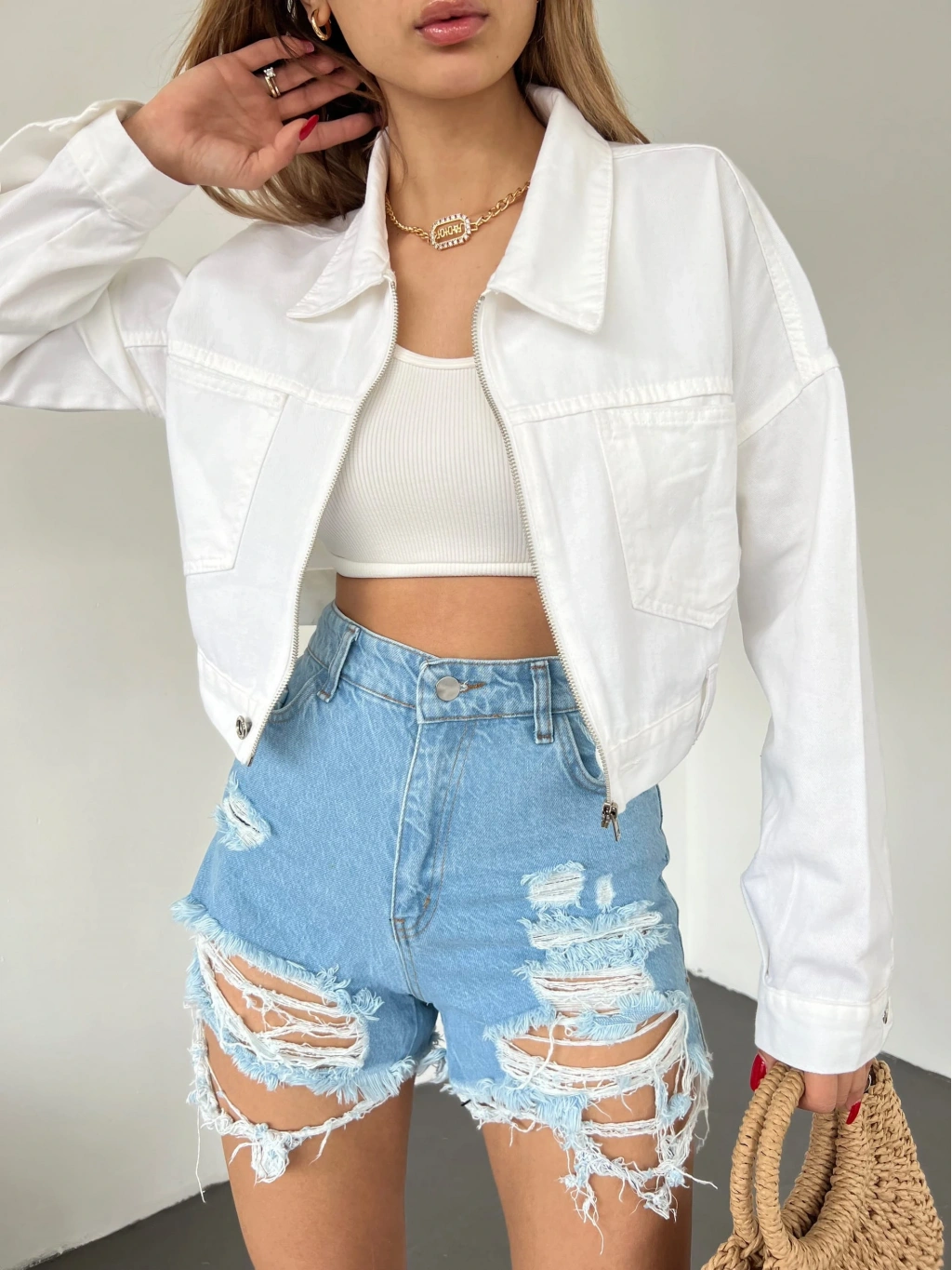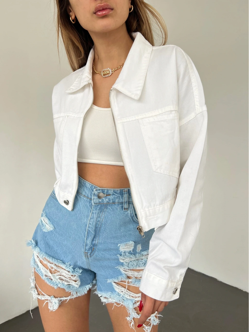 Pullaps Fermuarlı Çift Cepli Kot Mont Beyaz