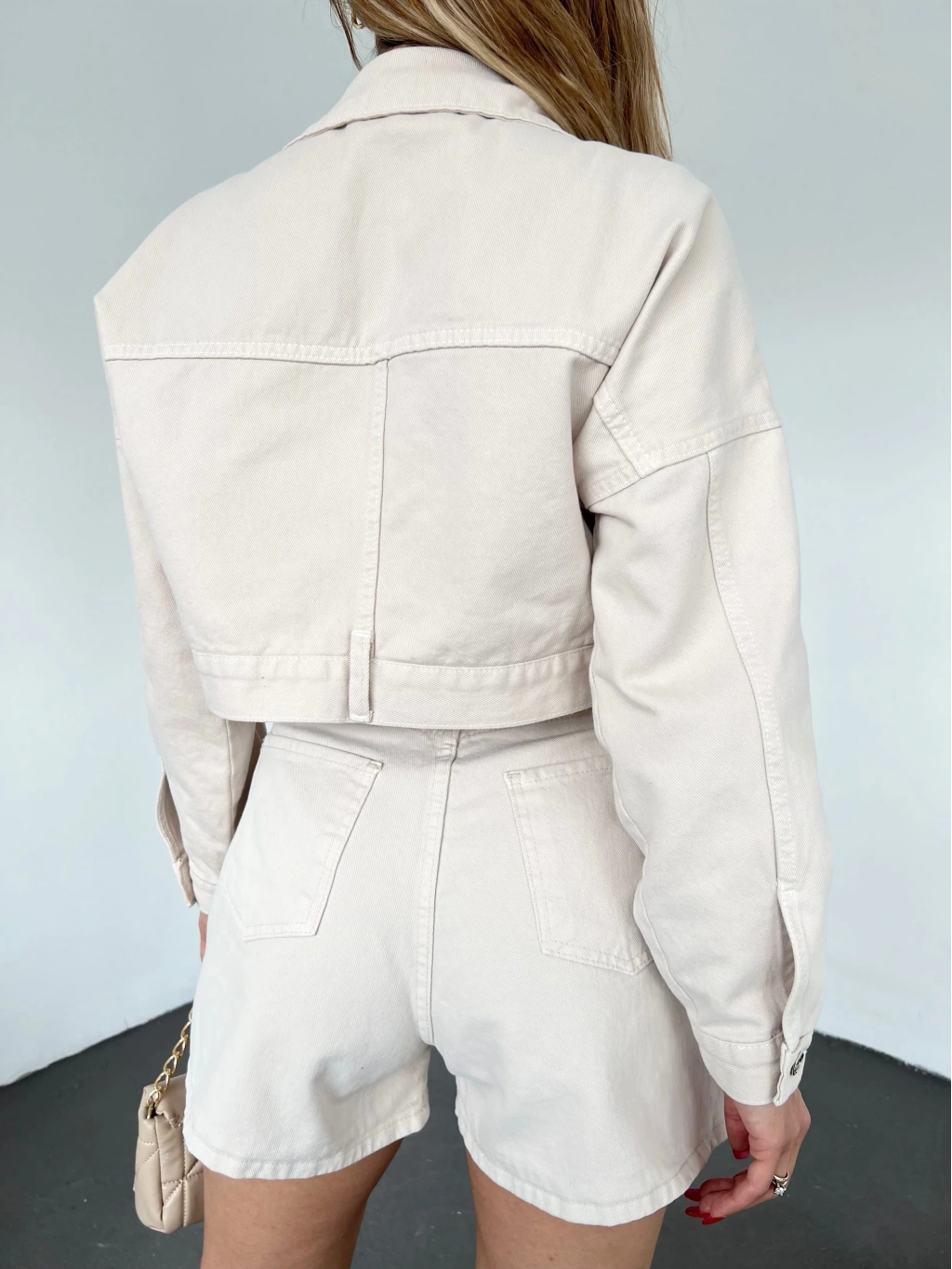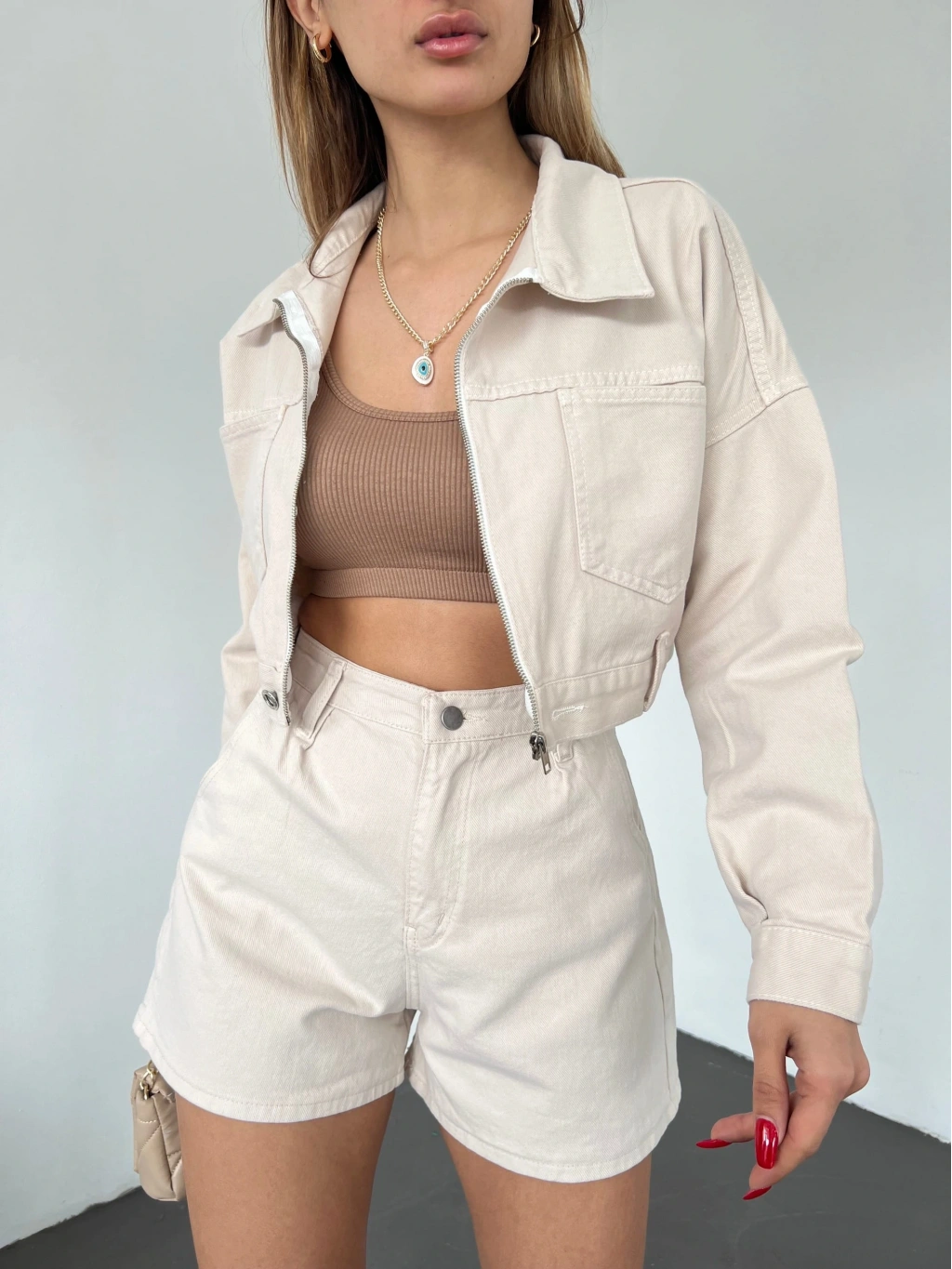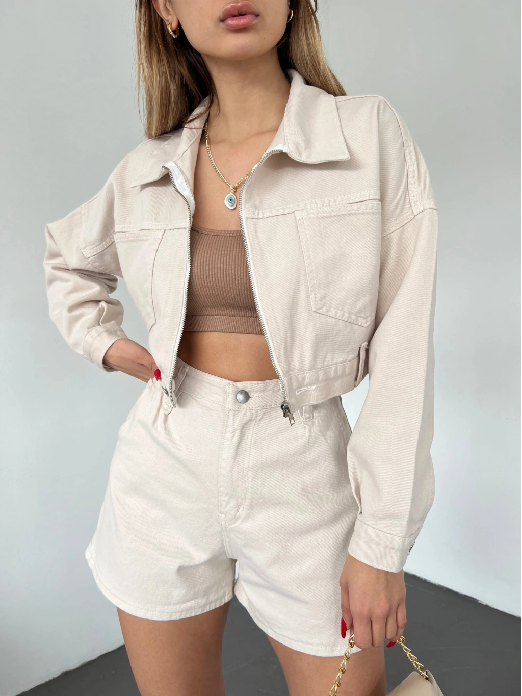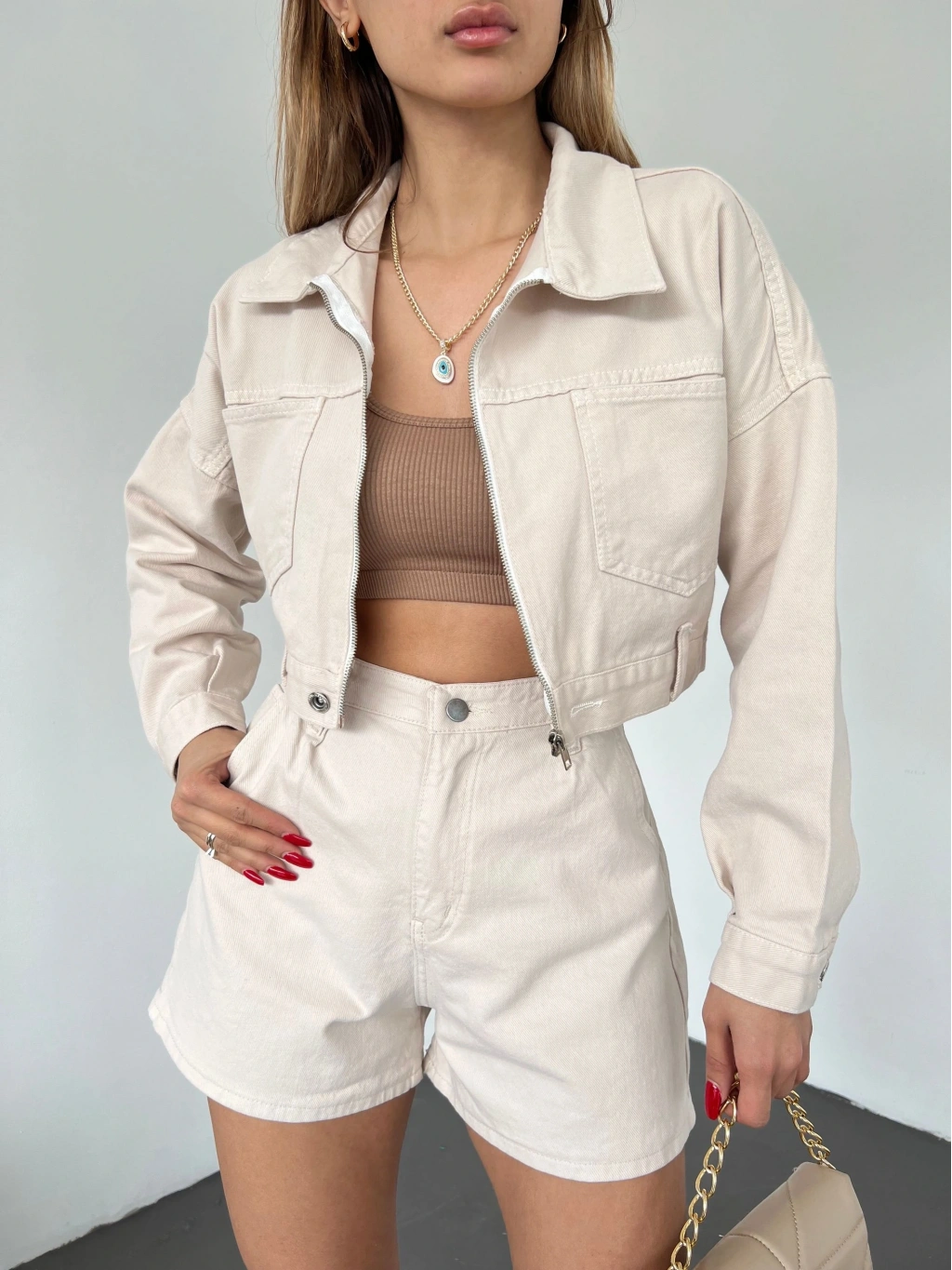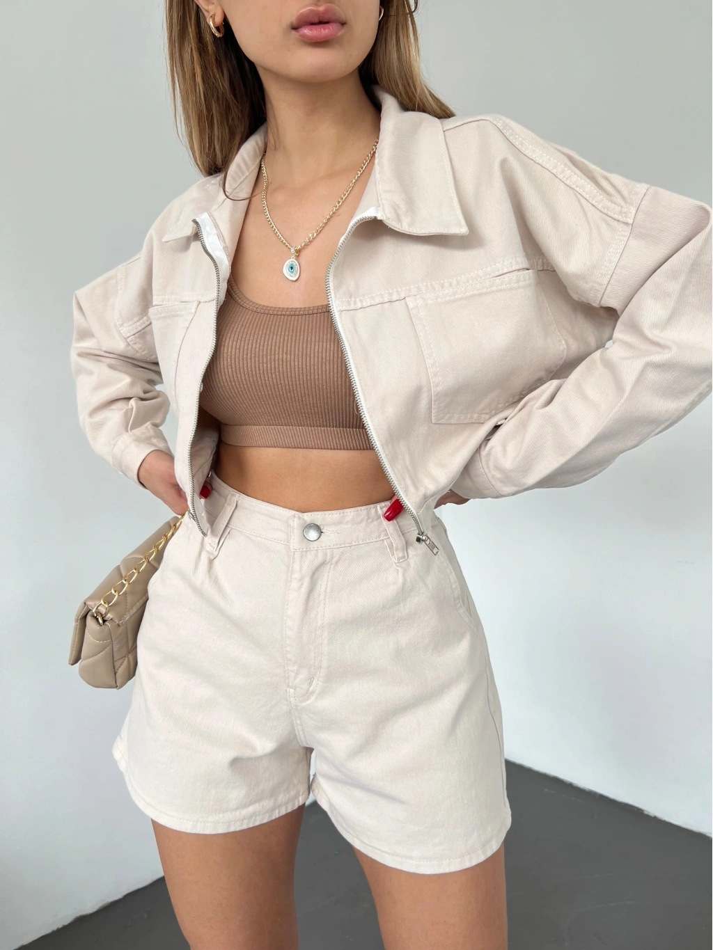 Pullaps Fermuarlı Çift Cepli Kot Mont Krem