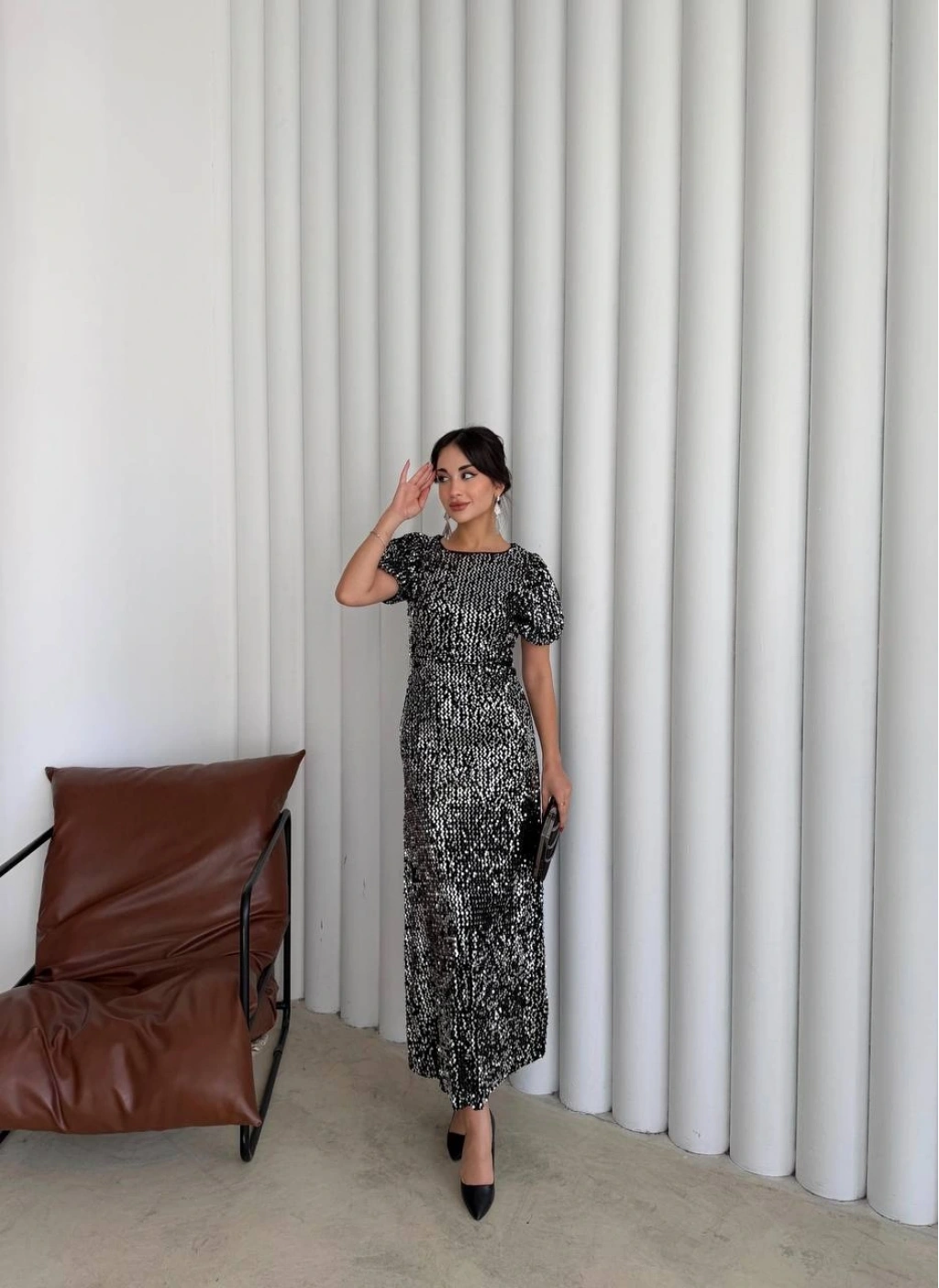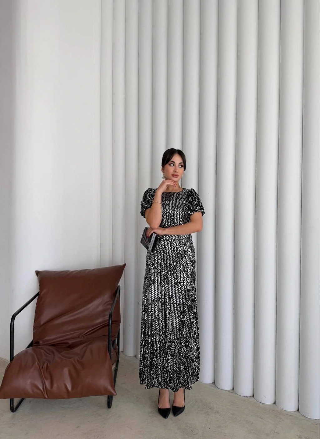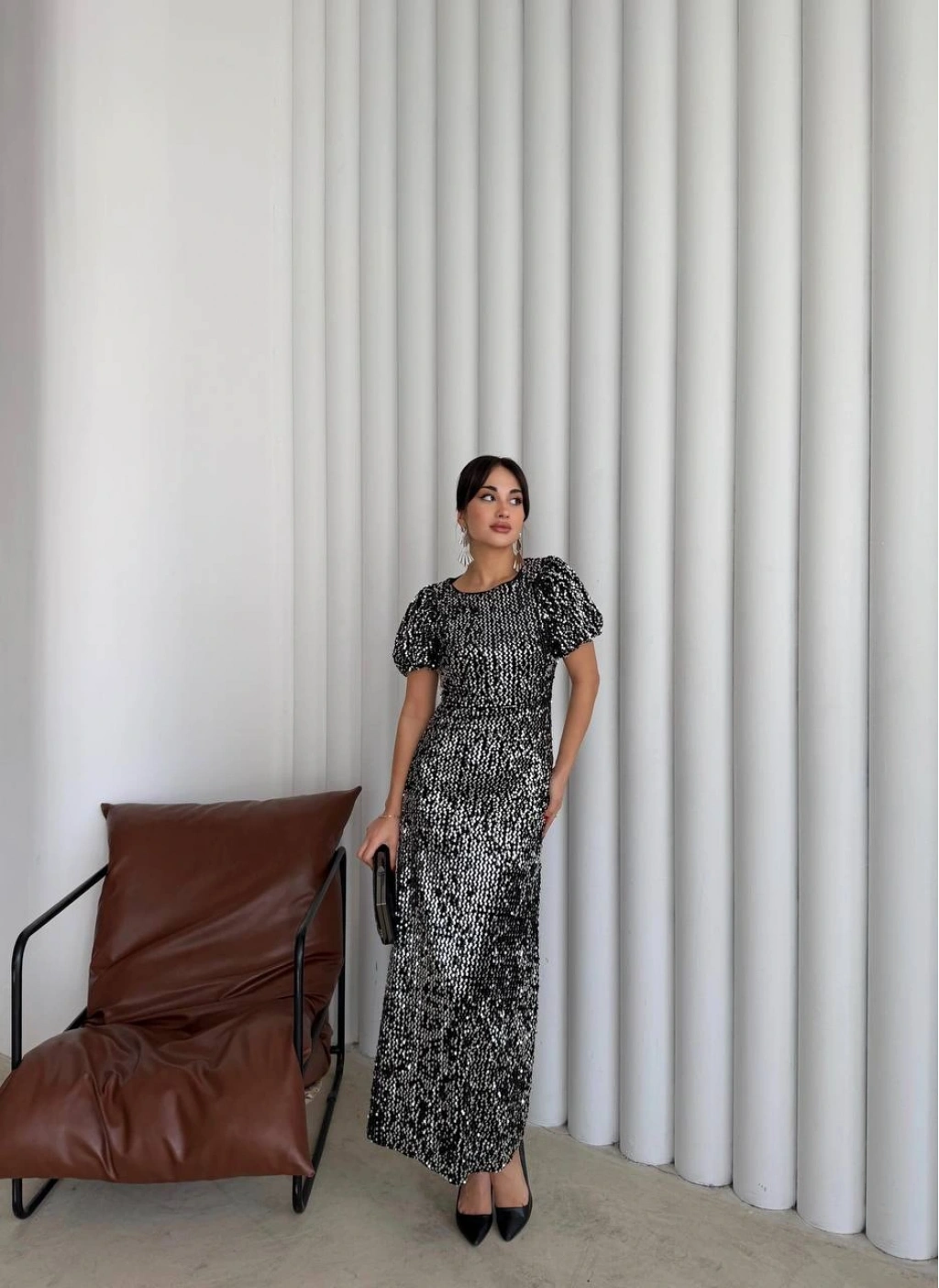 Bu büyüleyici  pul payetli maxi elbise ile tüm dikkatleri üzerinize çekin. Özel davetler, nişan törenleri, yılbaşı partileri veya kokteyller için mükemmel bir seçimdir.