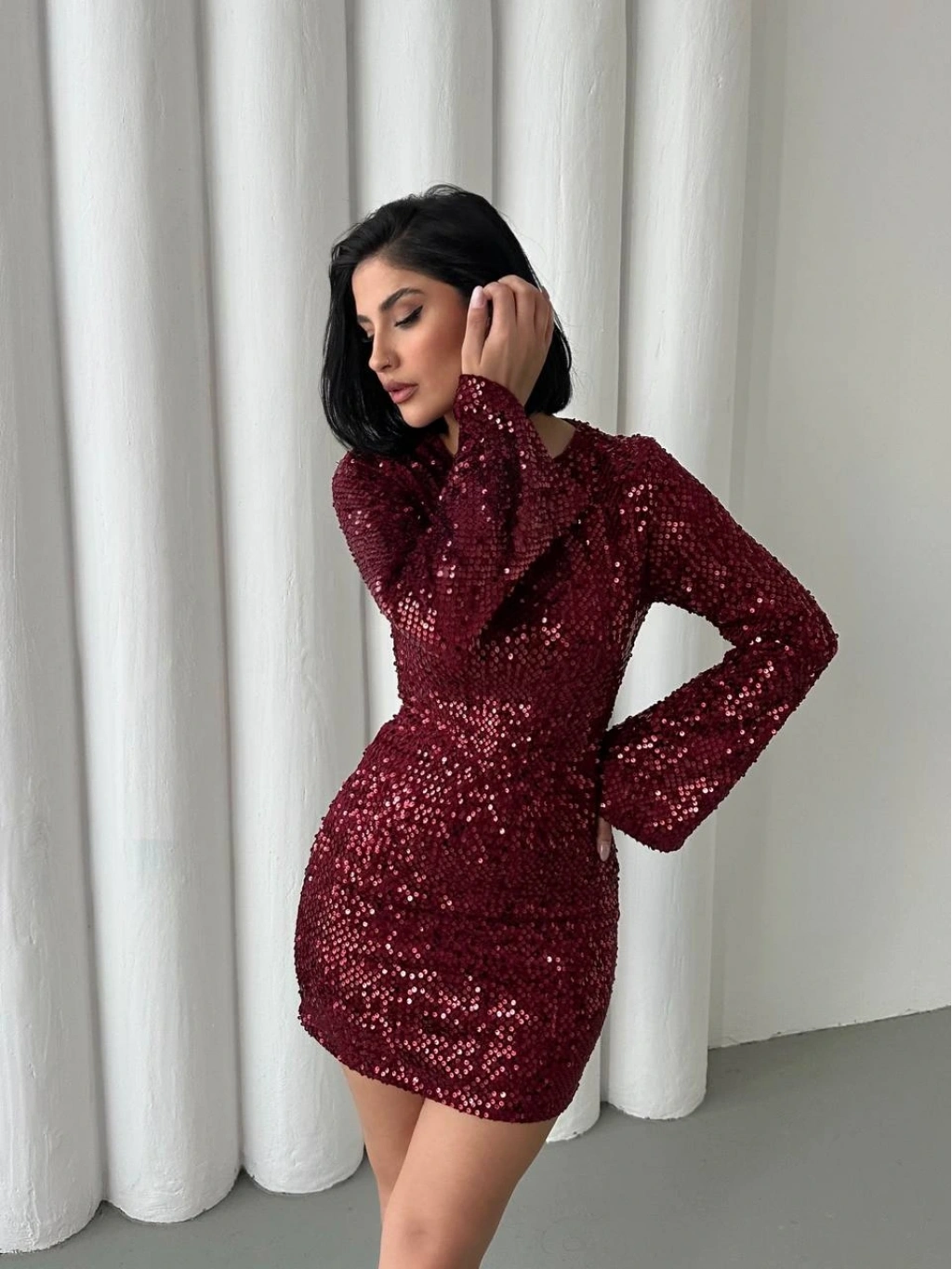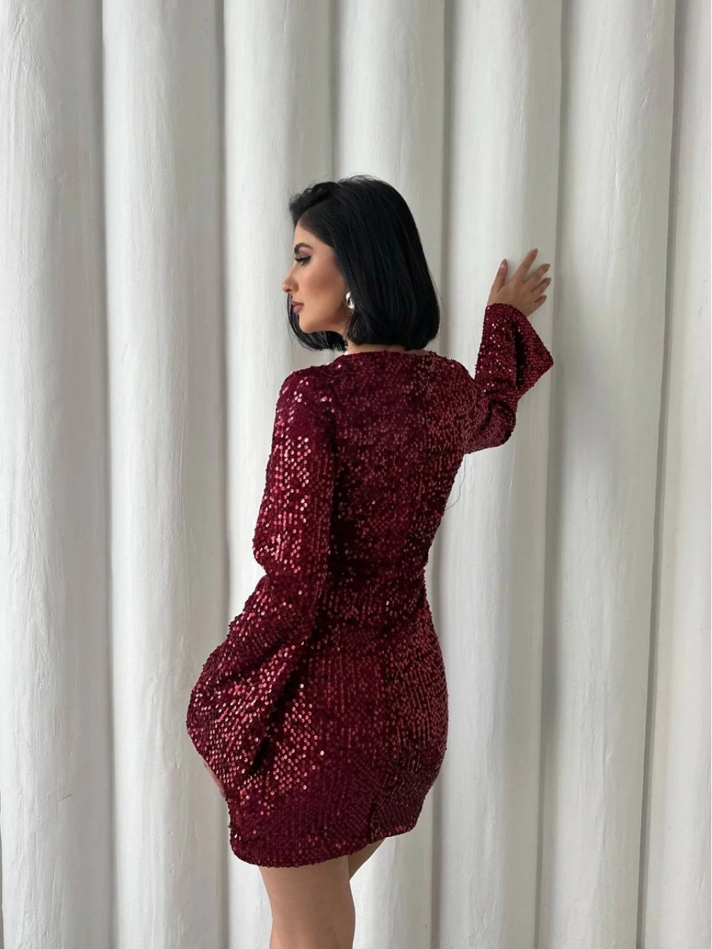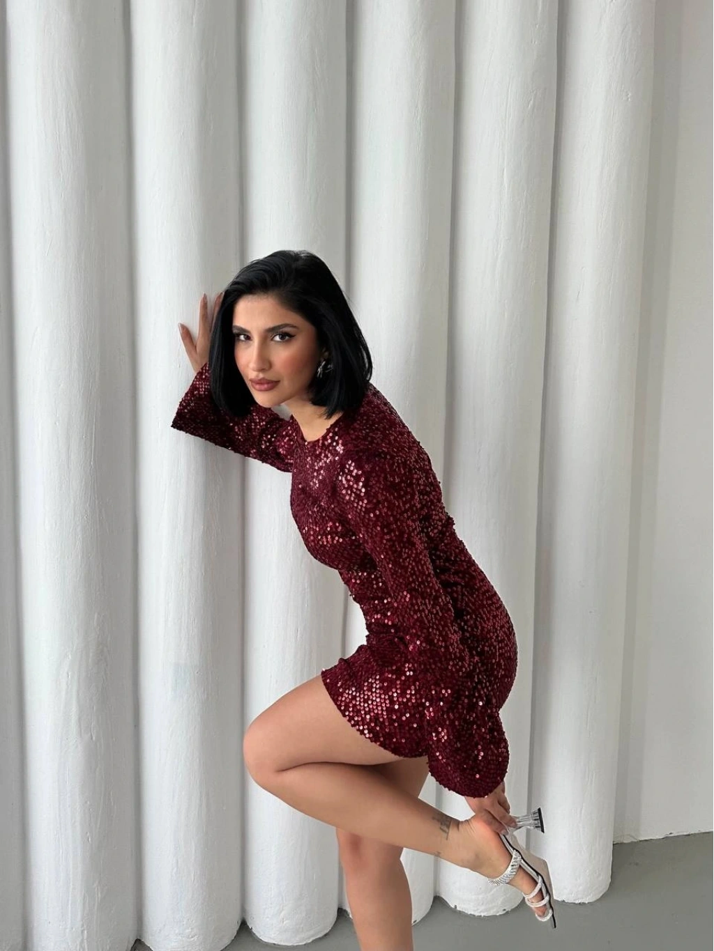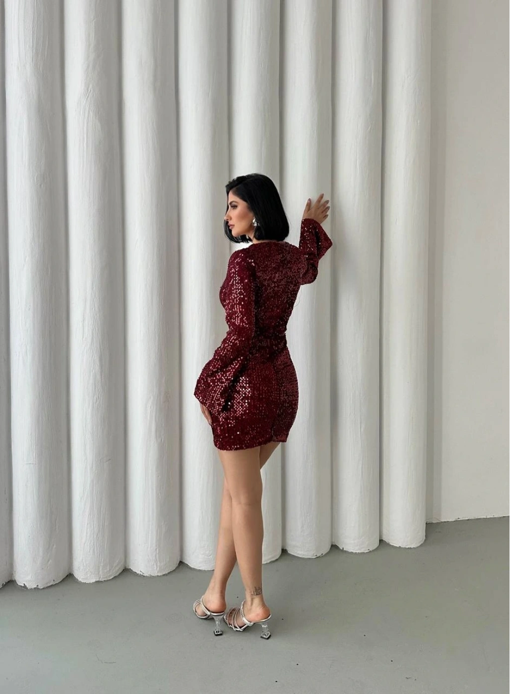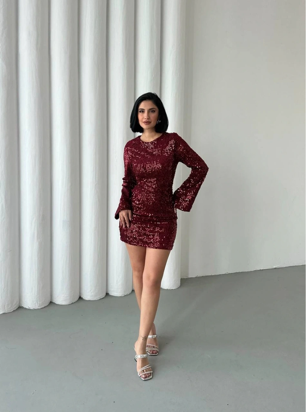 Göz Alıcı Parıltı: Baştan ayağa pul payetlerle işlenmiş kumaşı sayesinde girdiğiniz her ortamda ışıldamanızı sağlar.