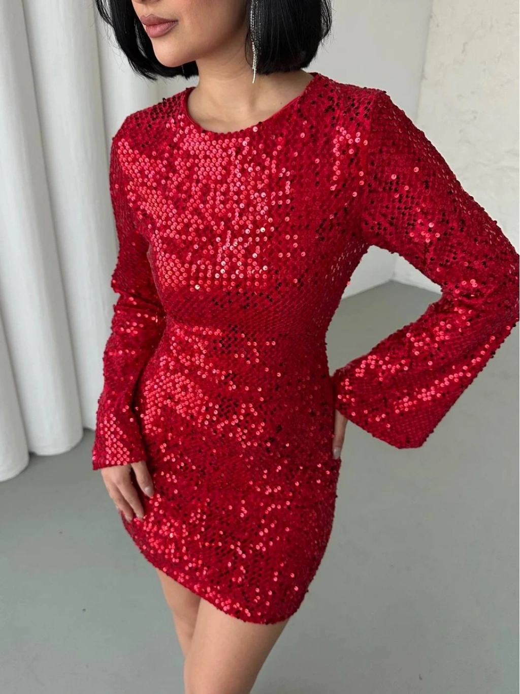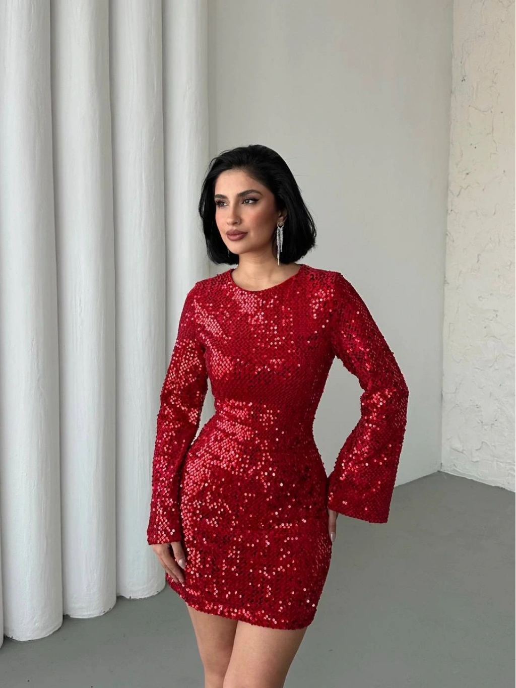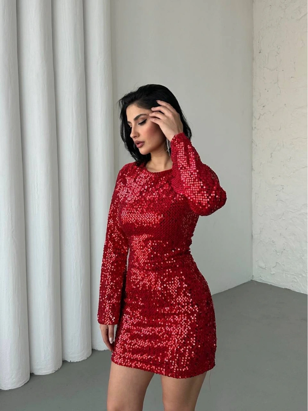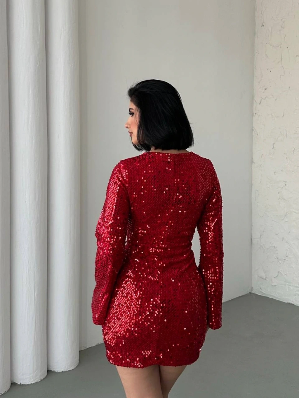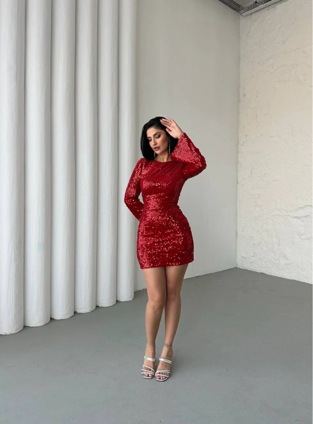 Bu büyüleyici  pul payetli midi elbise ile tüm dikkatleri üzerinize çekin. Özel davetler, nişan törenleri, yılbaşı partileri veya kokteyller için mükemmel bir seçimdir.