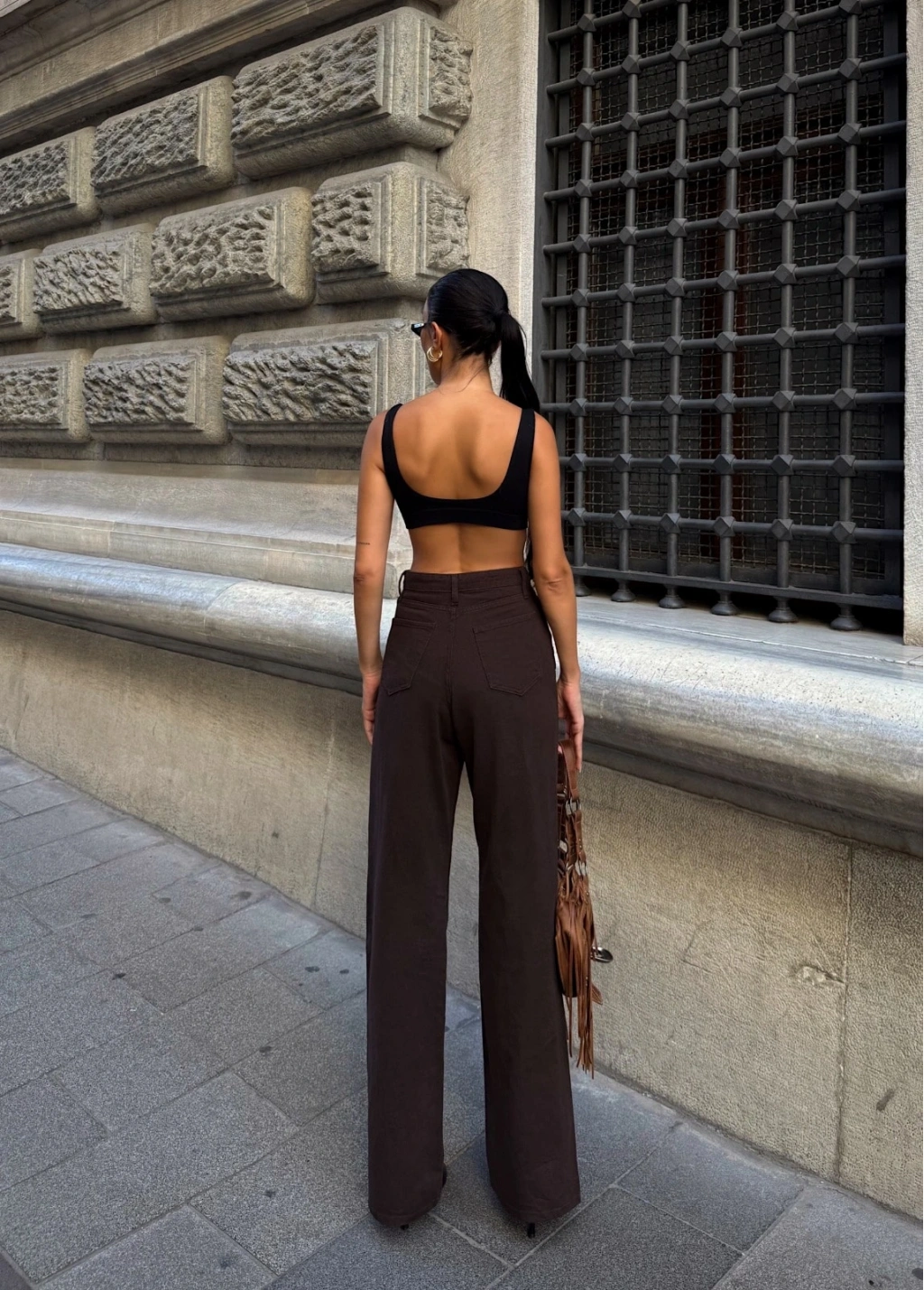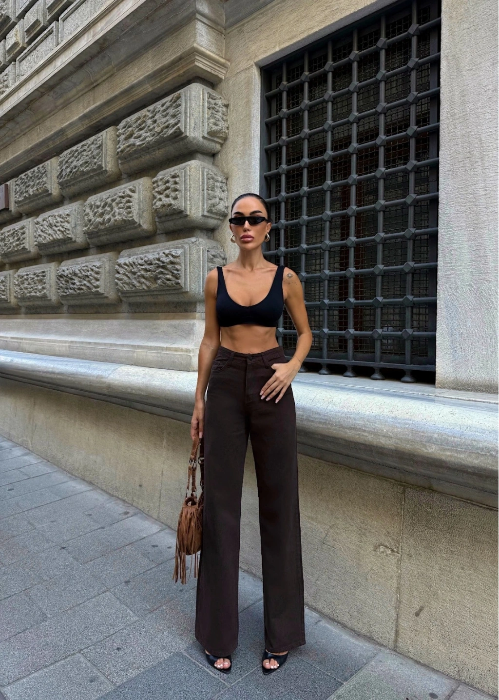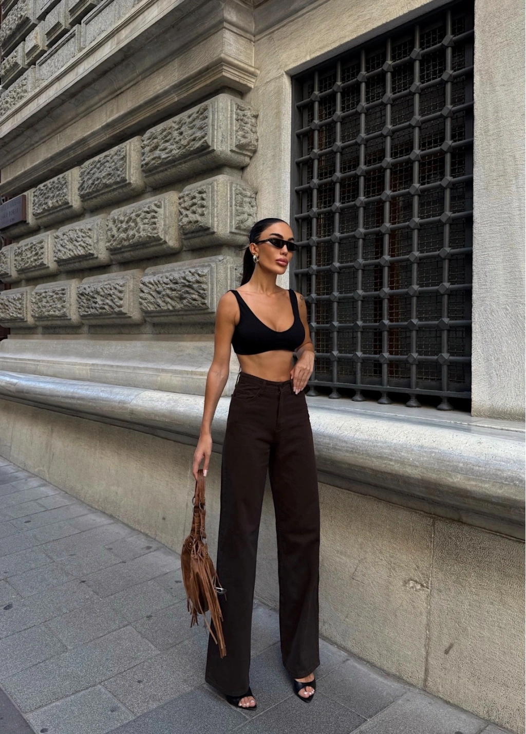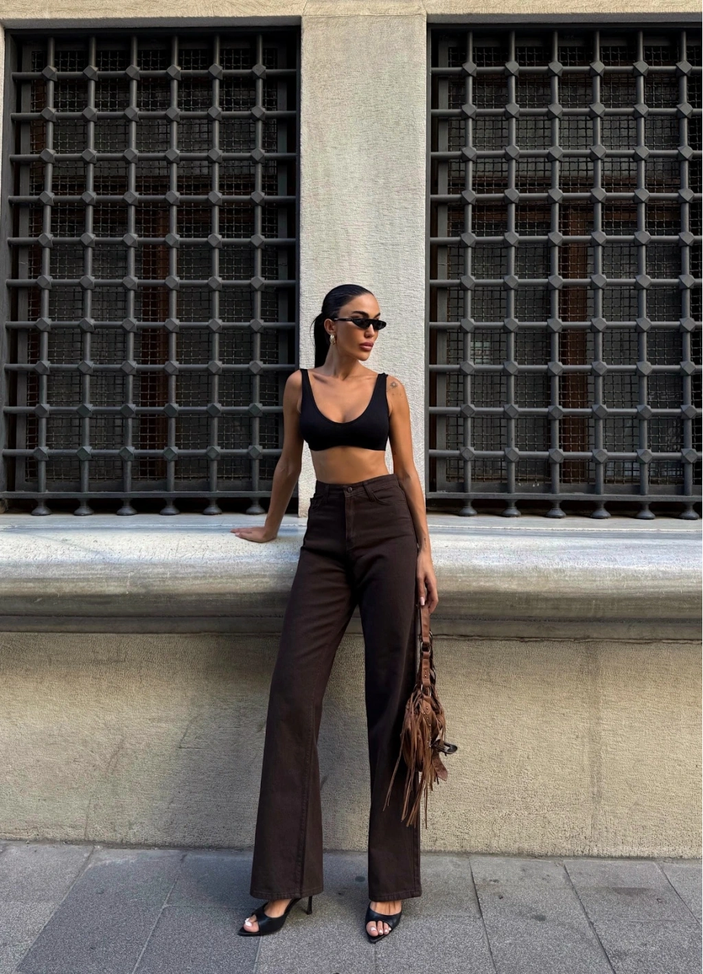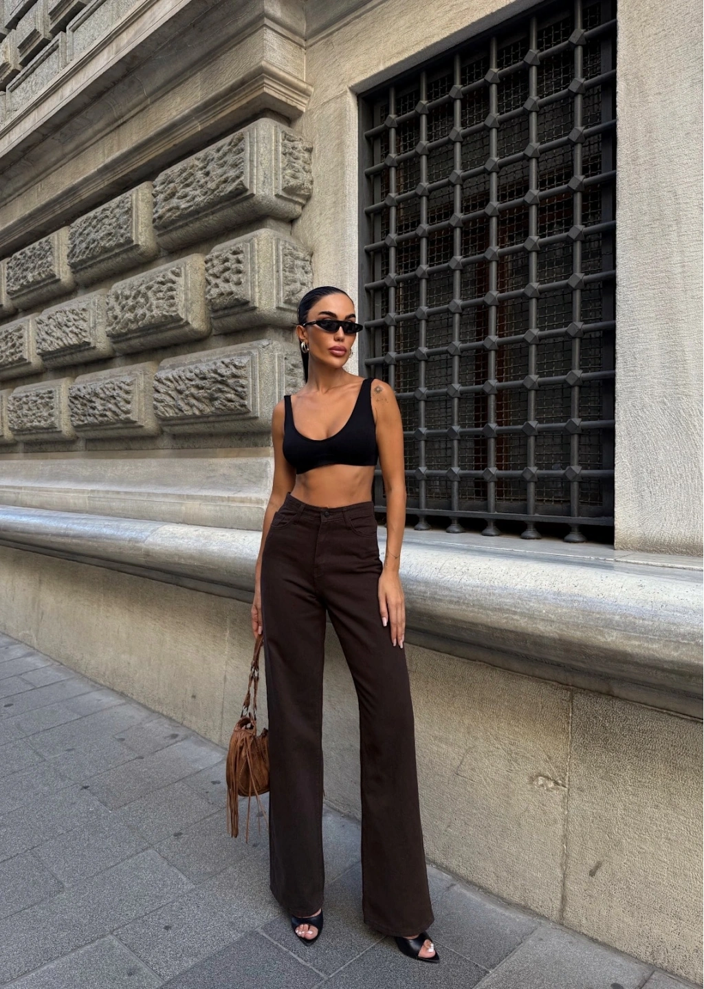 Pullaps Yüksek Bel İspanyol Paça Denim Pantolon Kahve