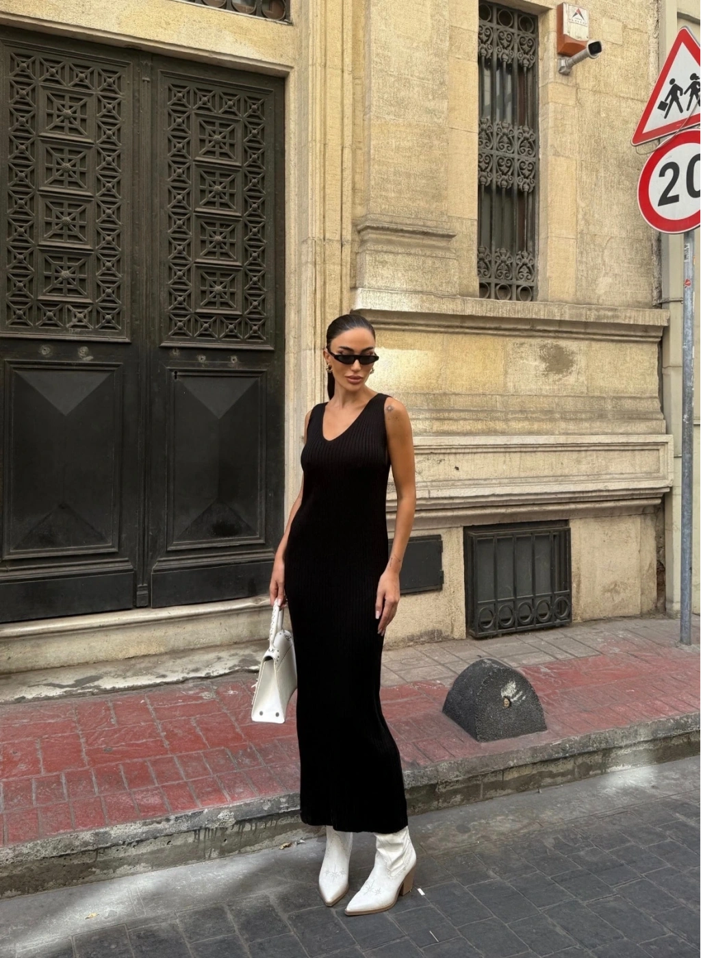 Mükemmel Uyum: Elbisenin ve kazağın birbirini tamamlayan renkleri ve kesimi ile daima şık ve uyumlu bir görünüm.
