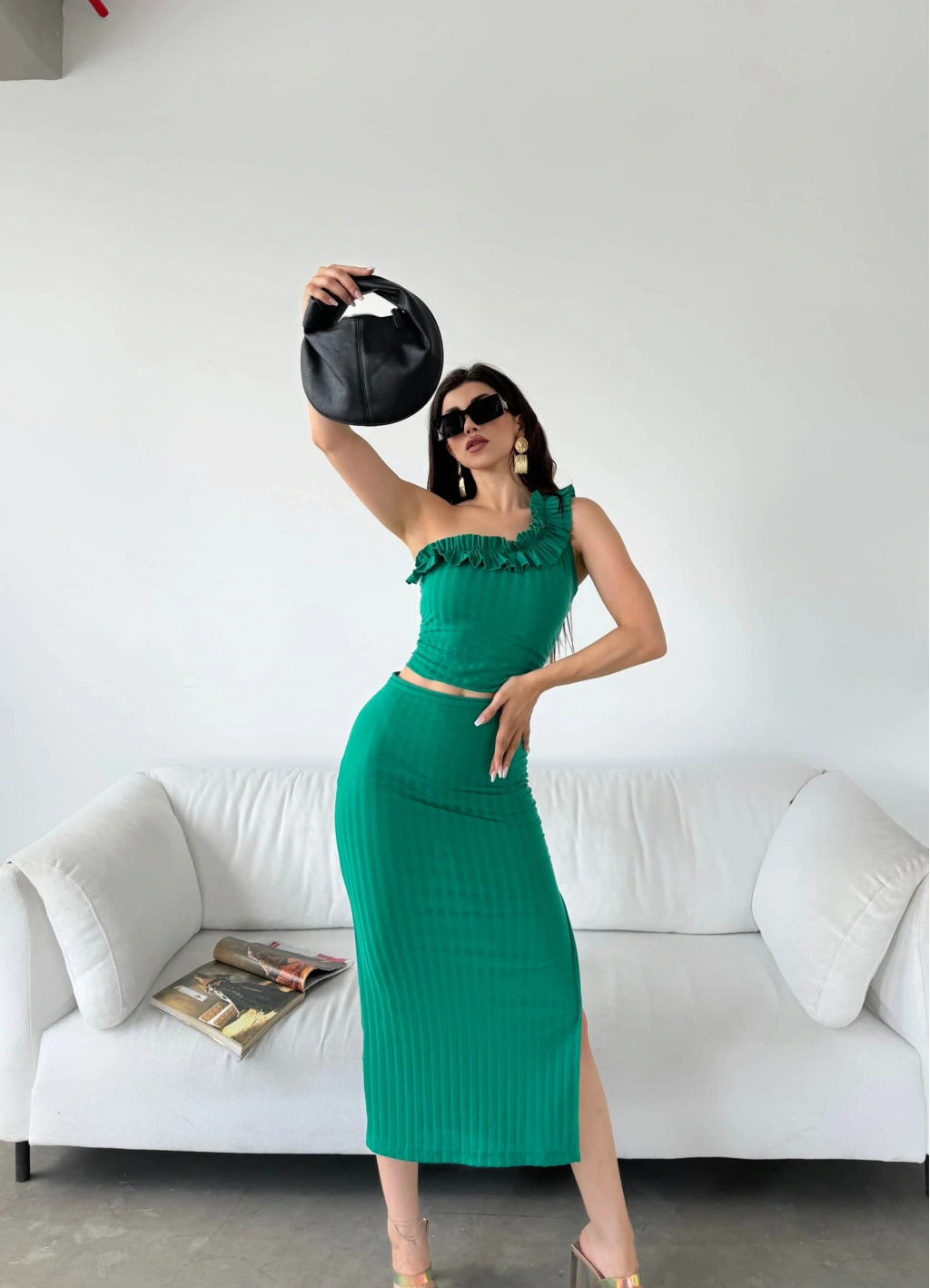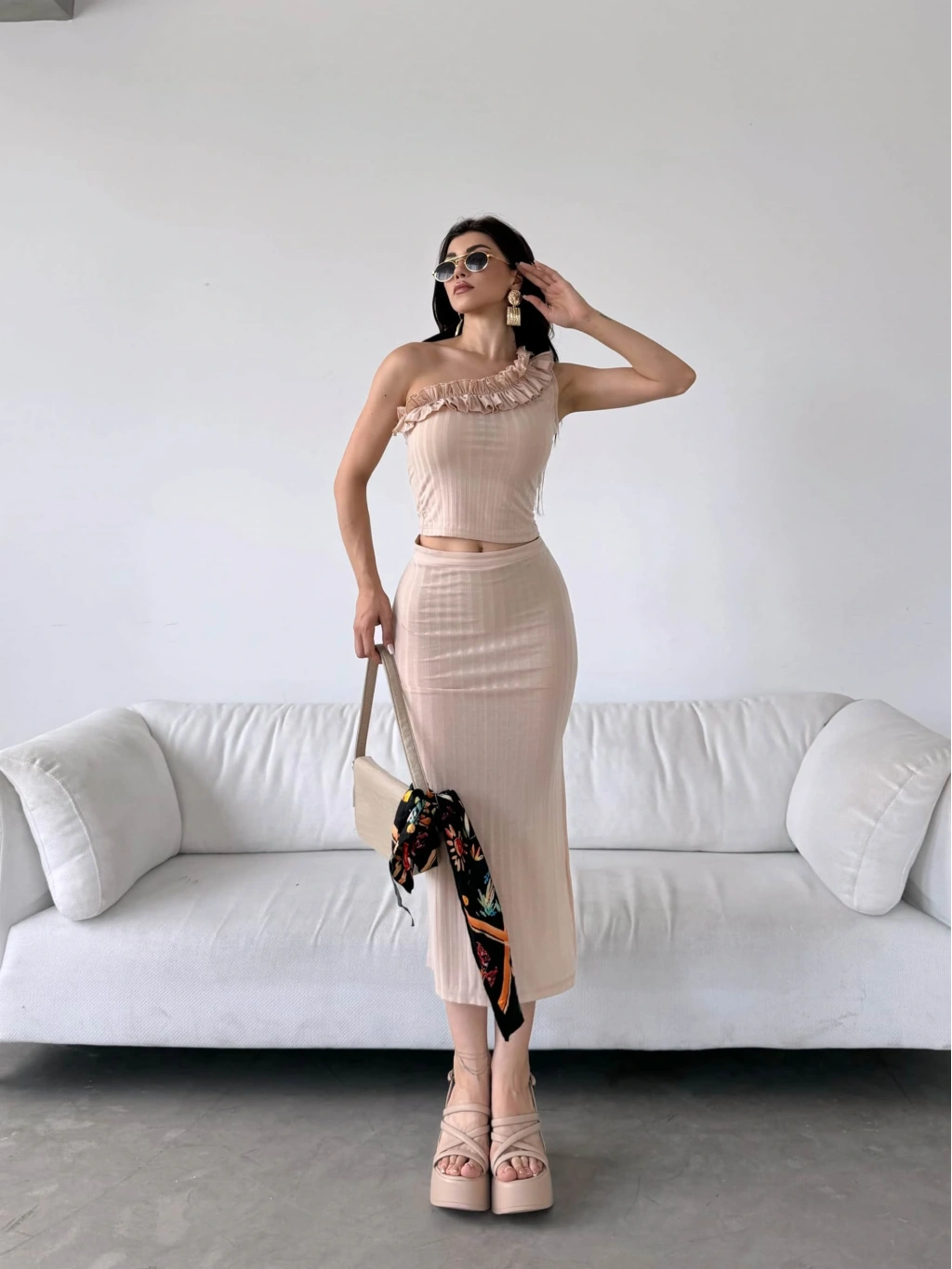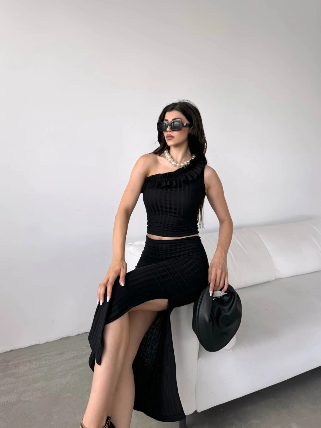 Ürün Adı :Tek Omuz Fırfır Detaylı Etek Ve Bluz Alt Üst Takım