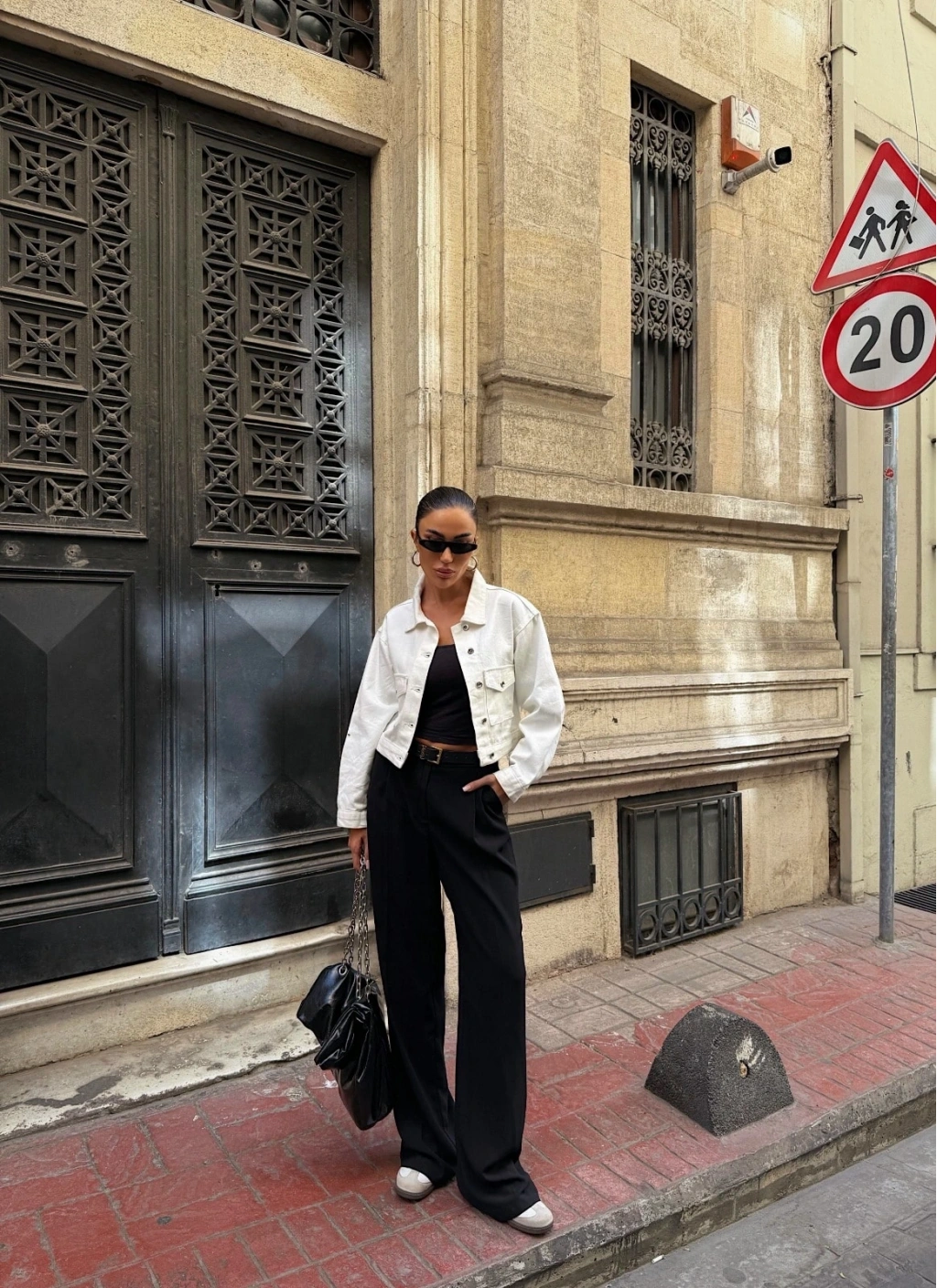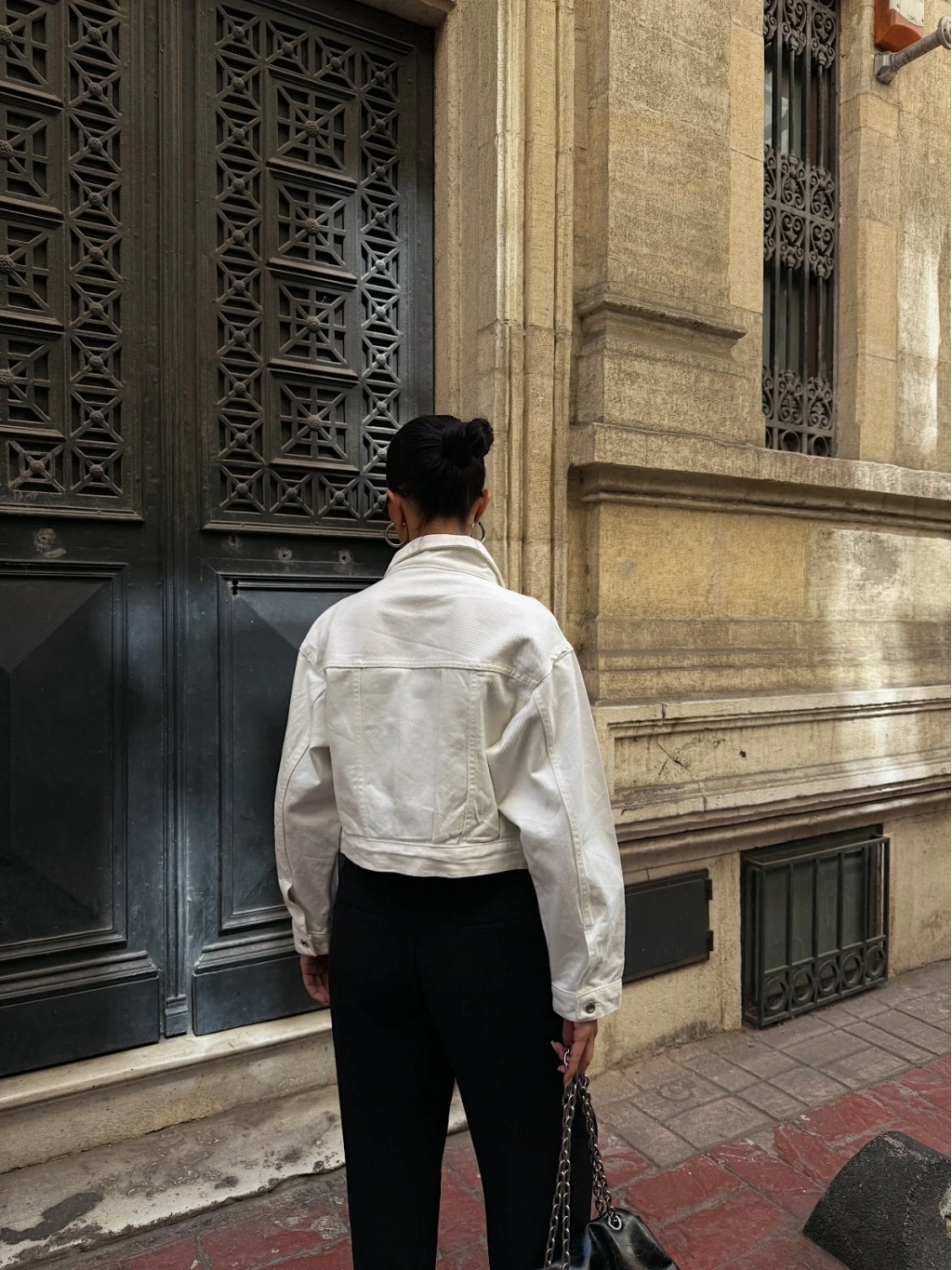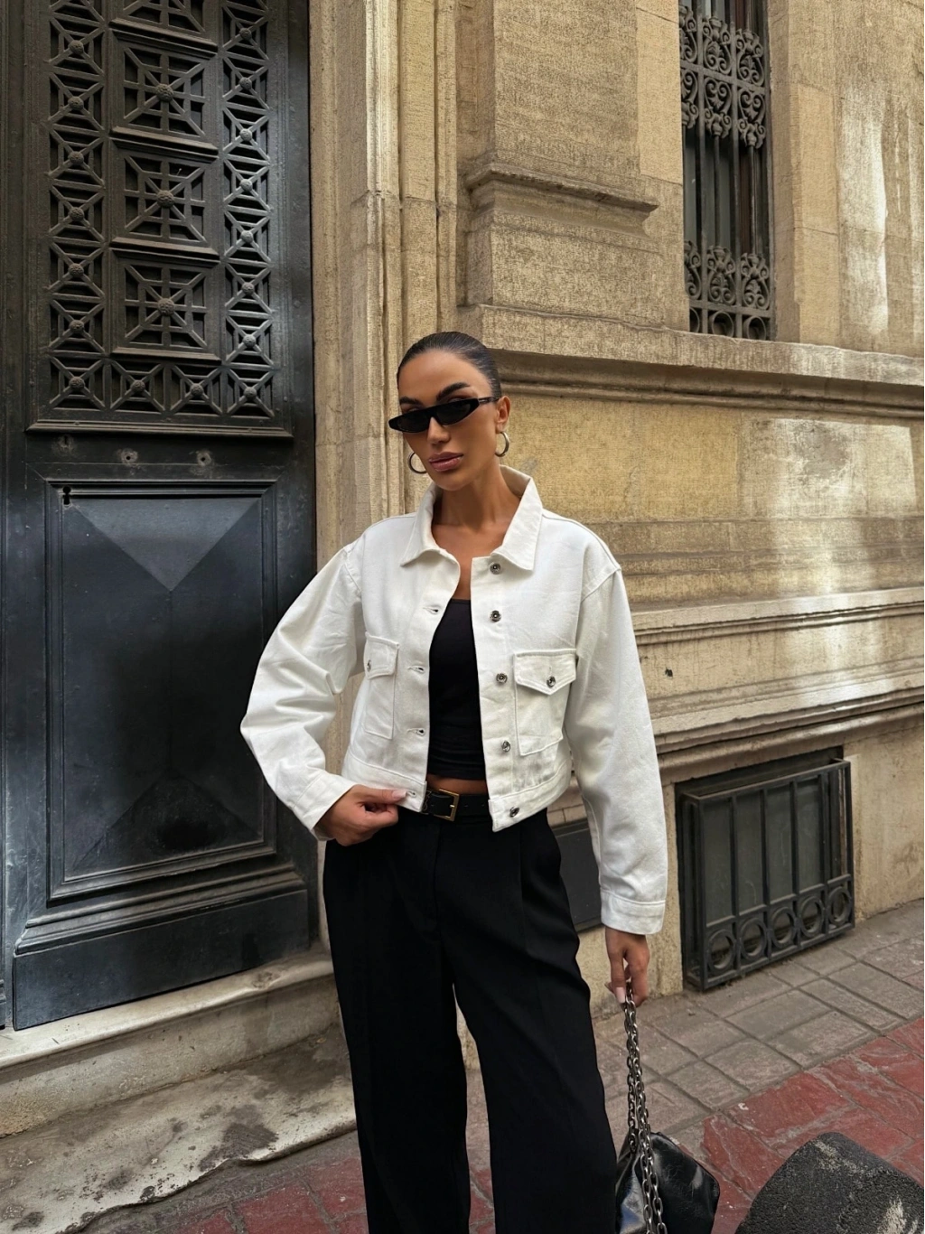 Pullaps Çift Cep Denim Crop Ceket Beyaz