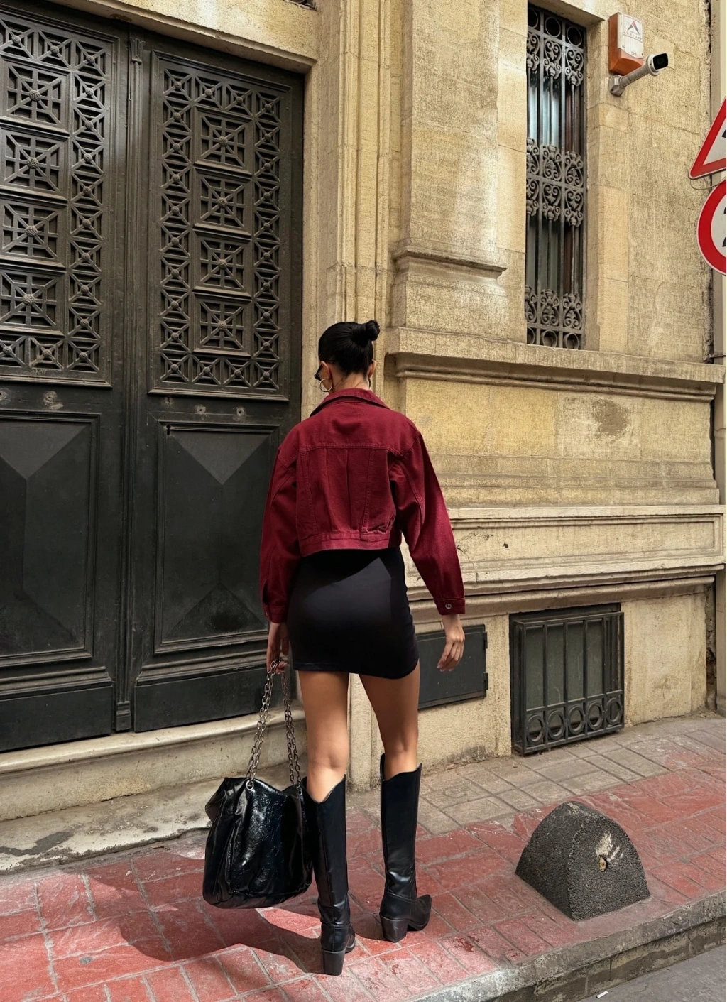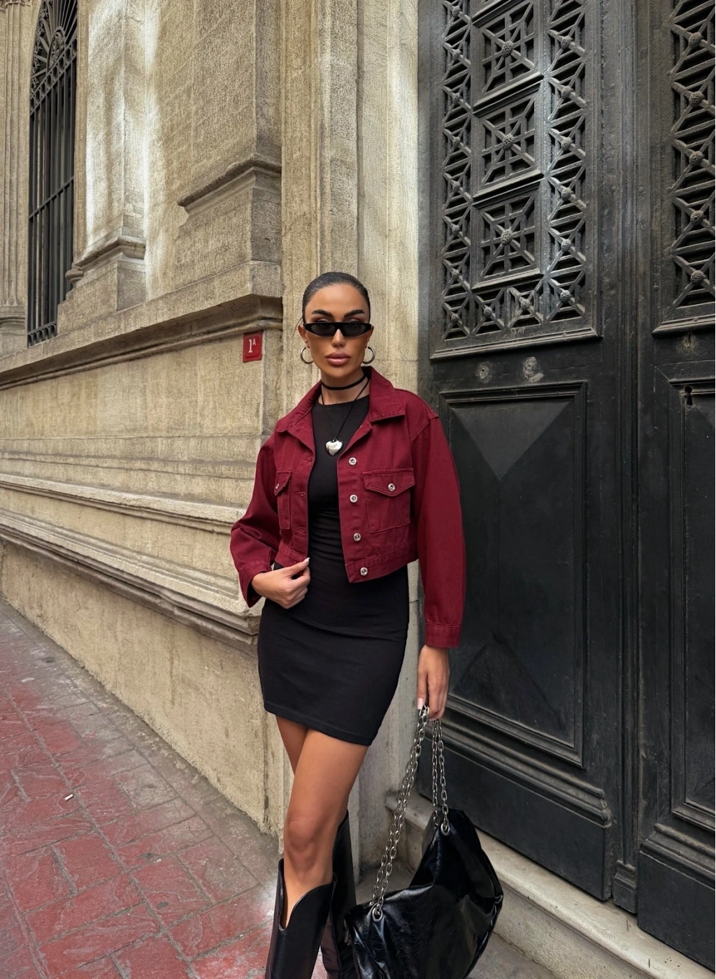 Pullaps Çift Cep Denim Crop Ceket Bordo